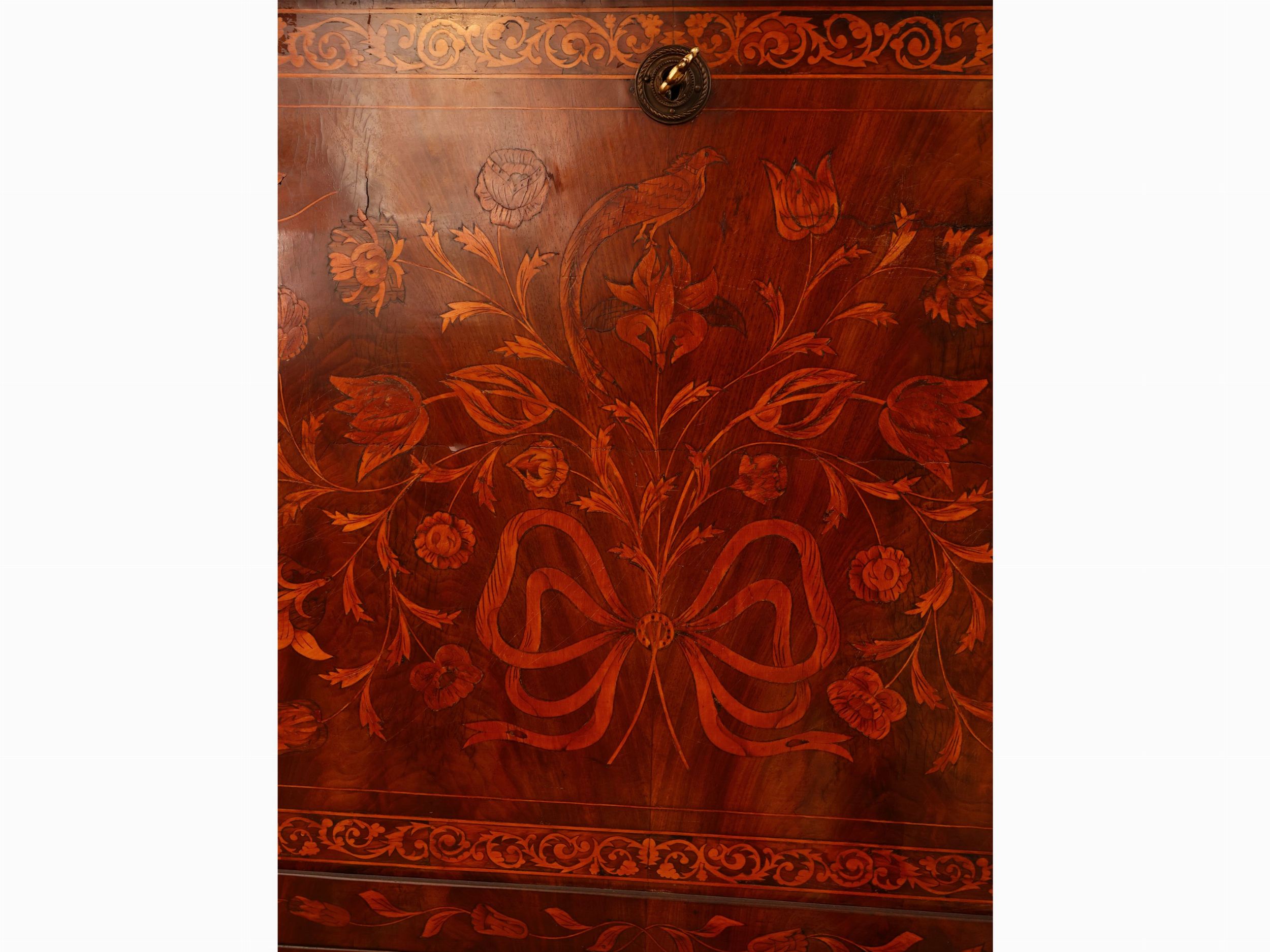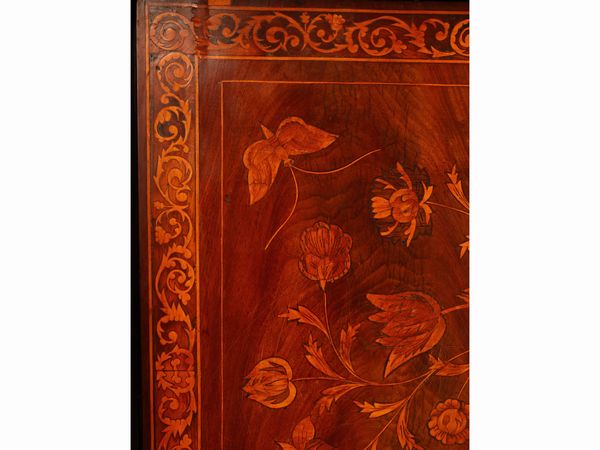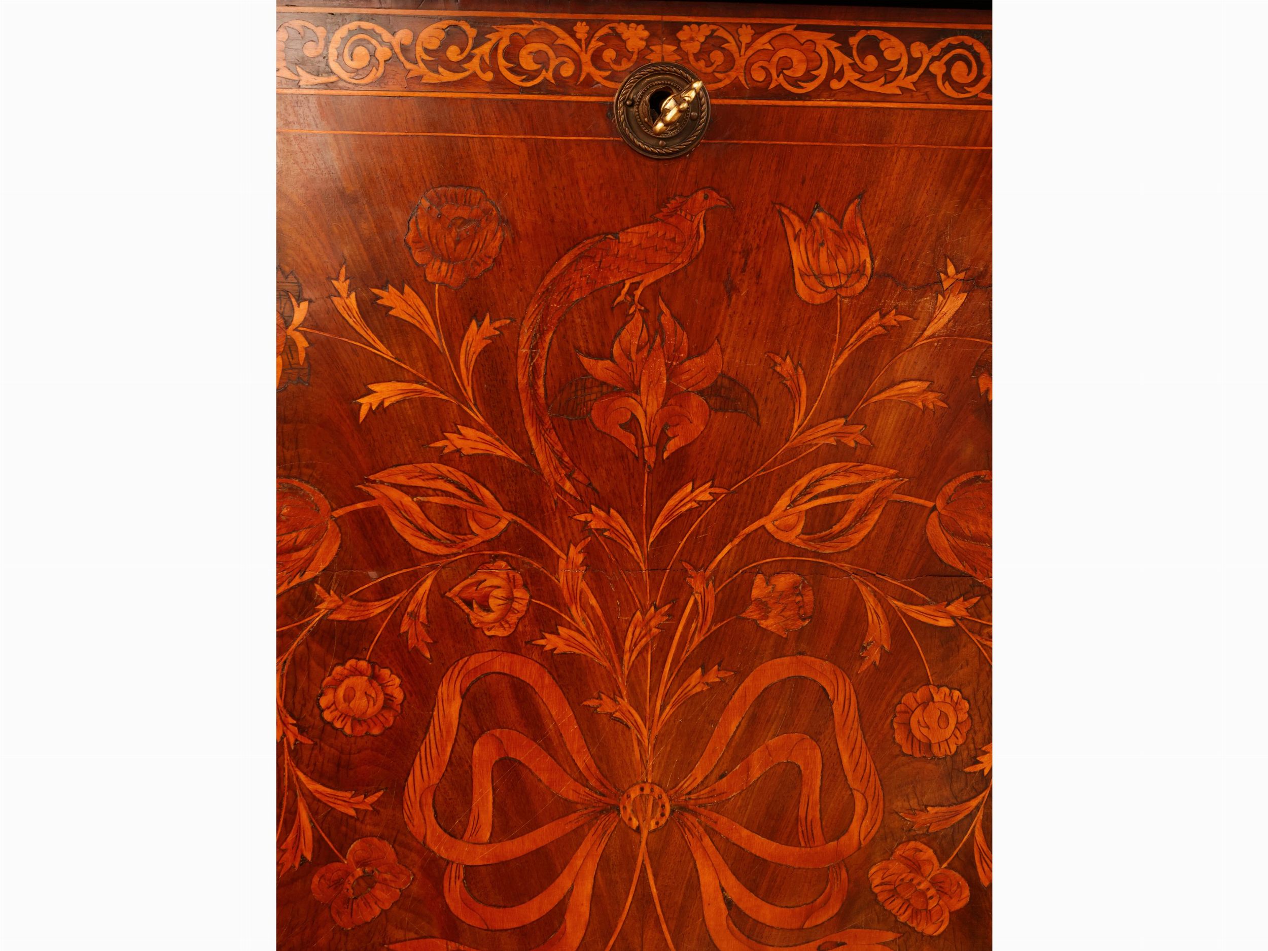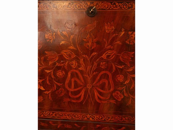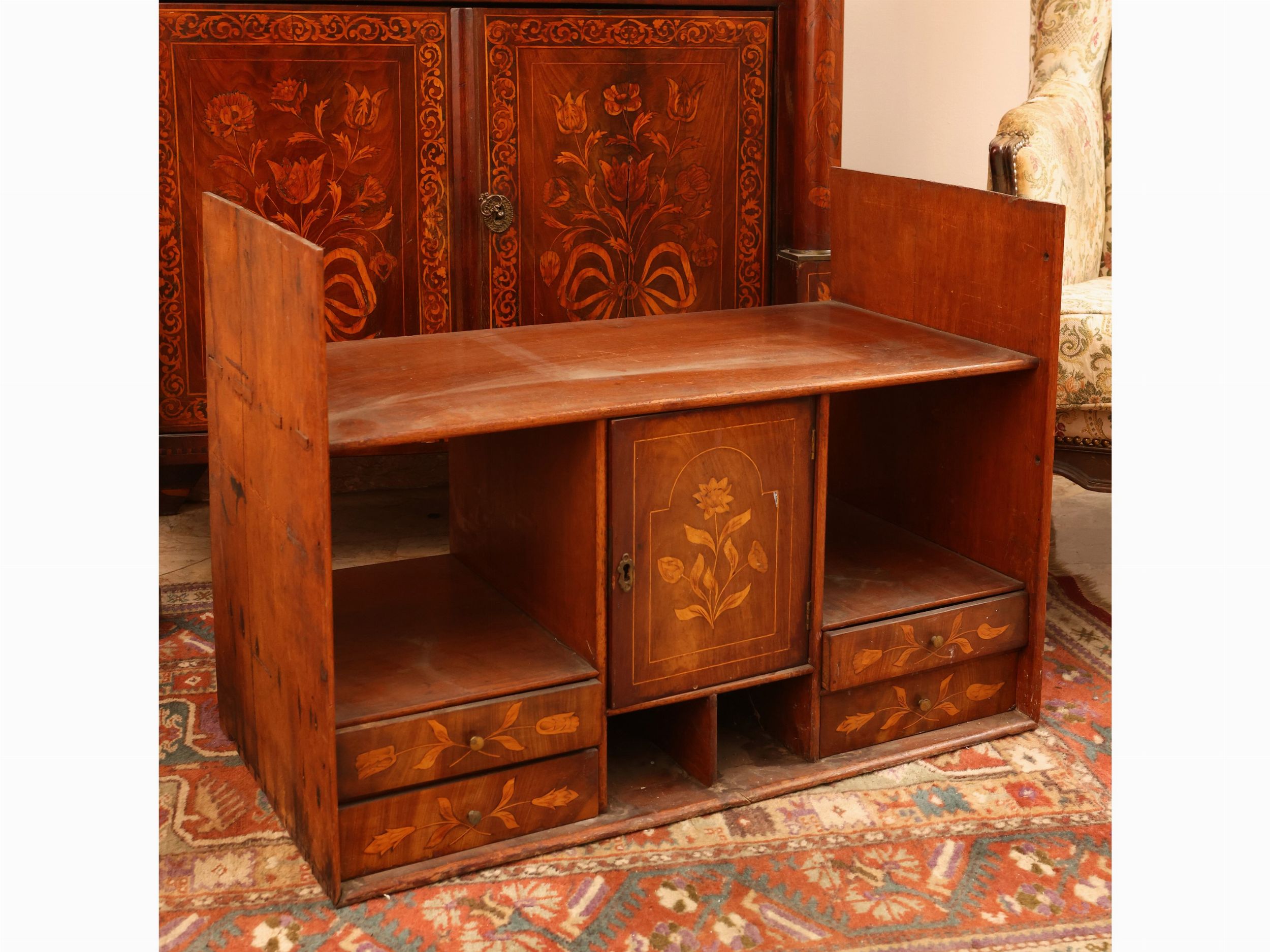 h cm 148x93x53 Olanda, XIX secolo interamente intarsiato in legni di frutto con trionfi floreali entro vasi e nodi d'Amore, sportello a calatoio a celare scarabattolo (mancanze e difetti, forse non pertinente), parte del piano rivestito in panno verde, due sportelli sottostanti tra lesene a colonna, piedi a plinto, alcuni difetti
