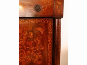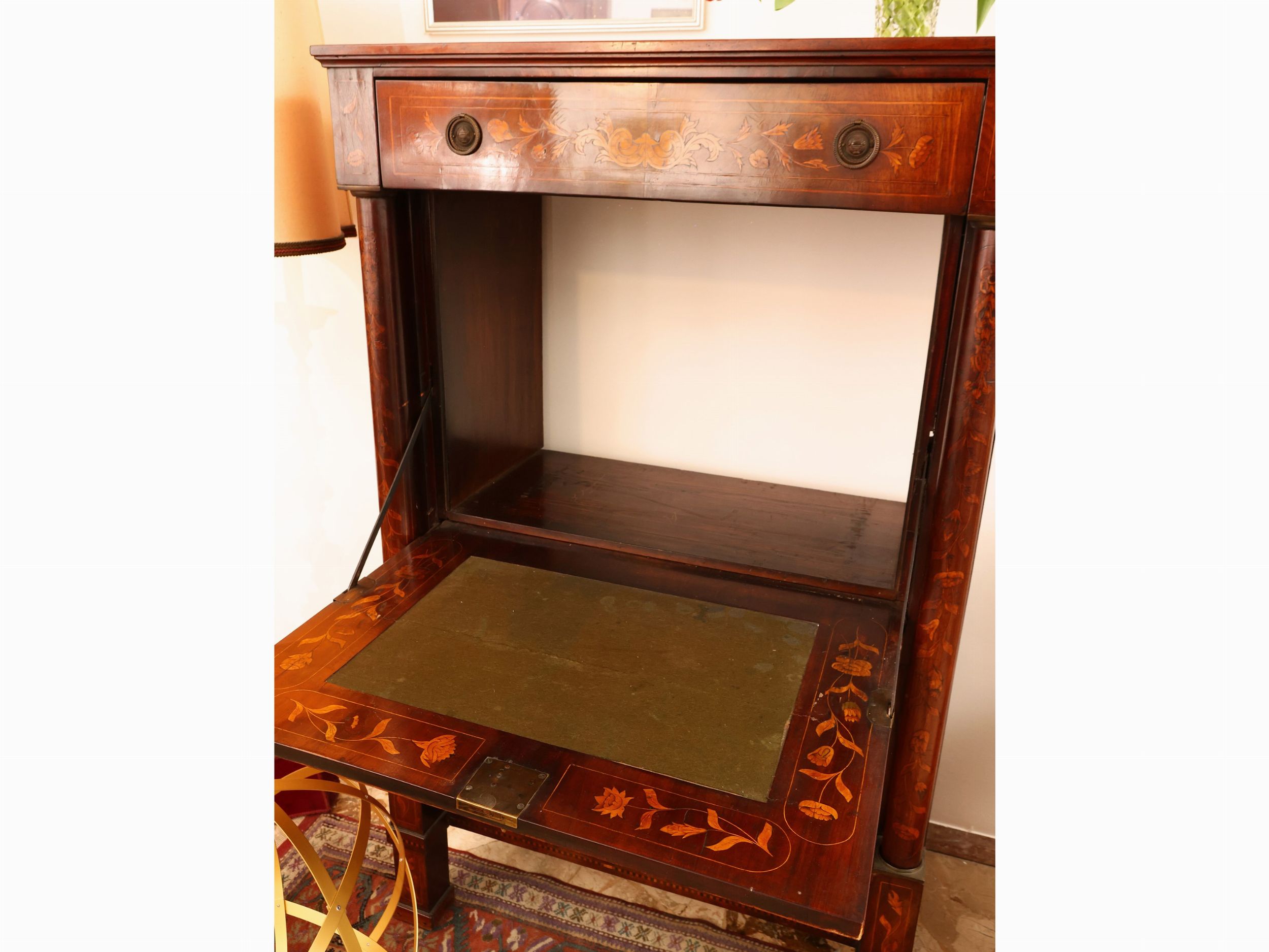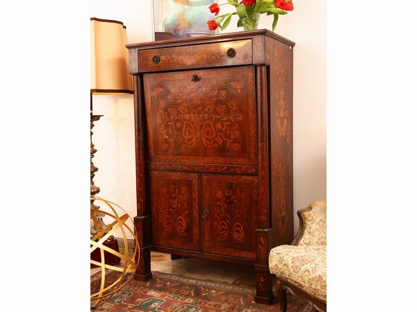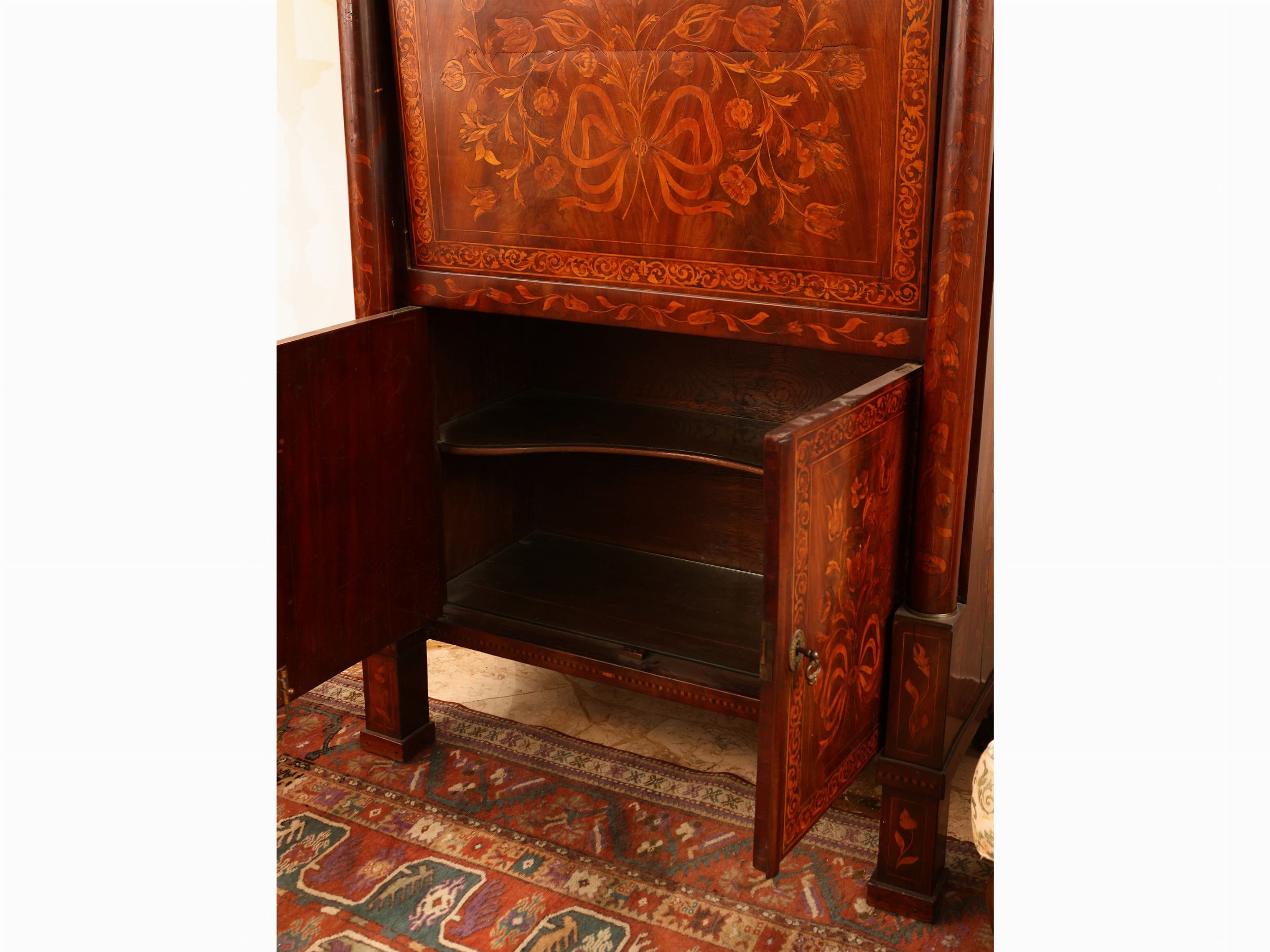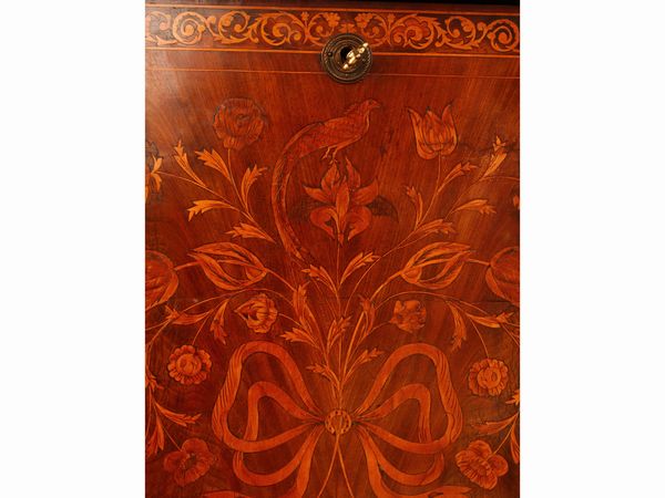h cm 148x93x53 Olanda, XIX secolo interamente intarsiato in legni di frutto con trionfi floreali entro vasi e nodi d'Amore, sportello a calatoio a celare scarabattolo (mancanze e difetti, forse non pertinente), parte del piano rivestito in panno verde, due sportelli sottostanti tra lesene a colonna, piedi a plinto, alcuni difetti
