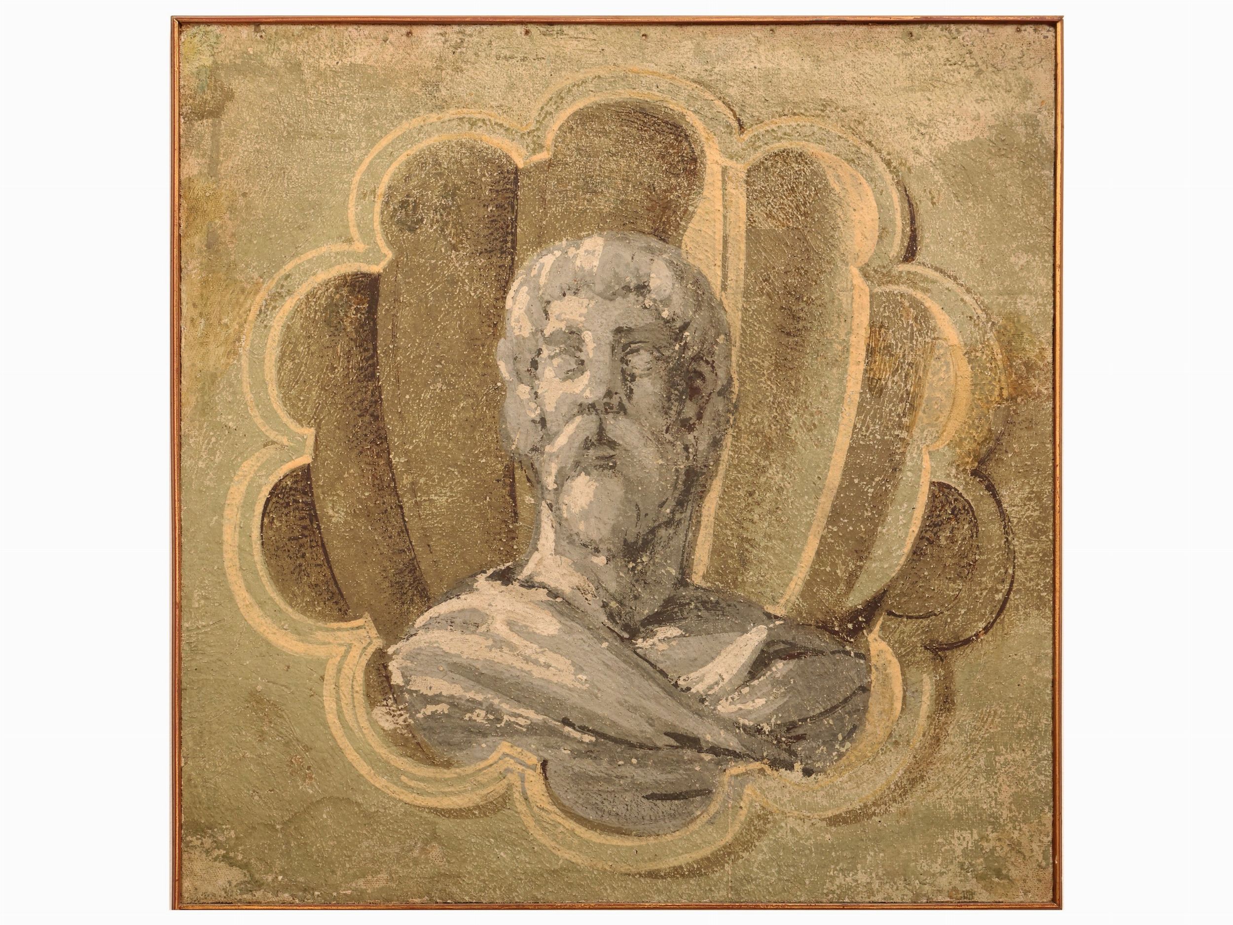 XIX secolo raffiguranti busti di personaggi entro nicchie a tromp-l'oeil, tecnica ad affresco su tela applicato a pannello in truciolato, difetti