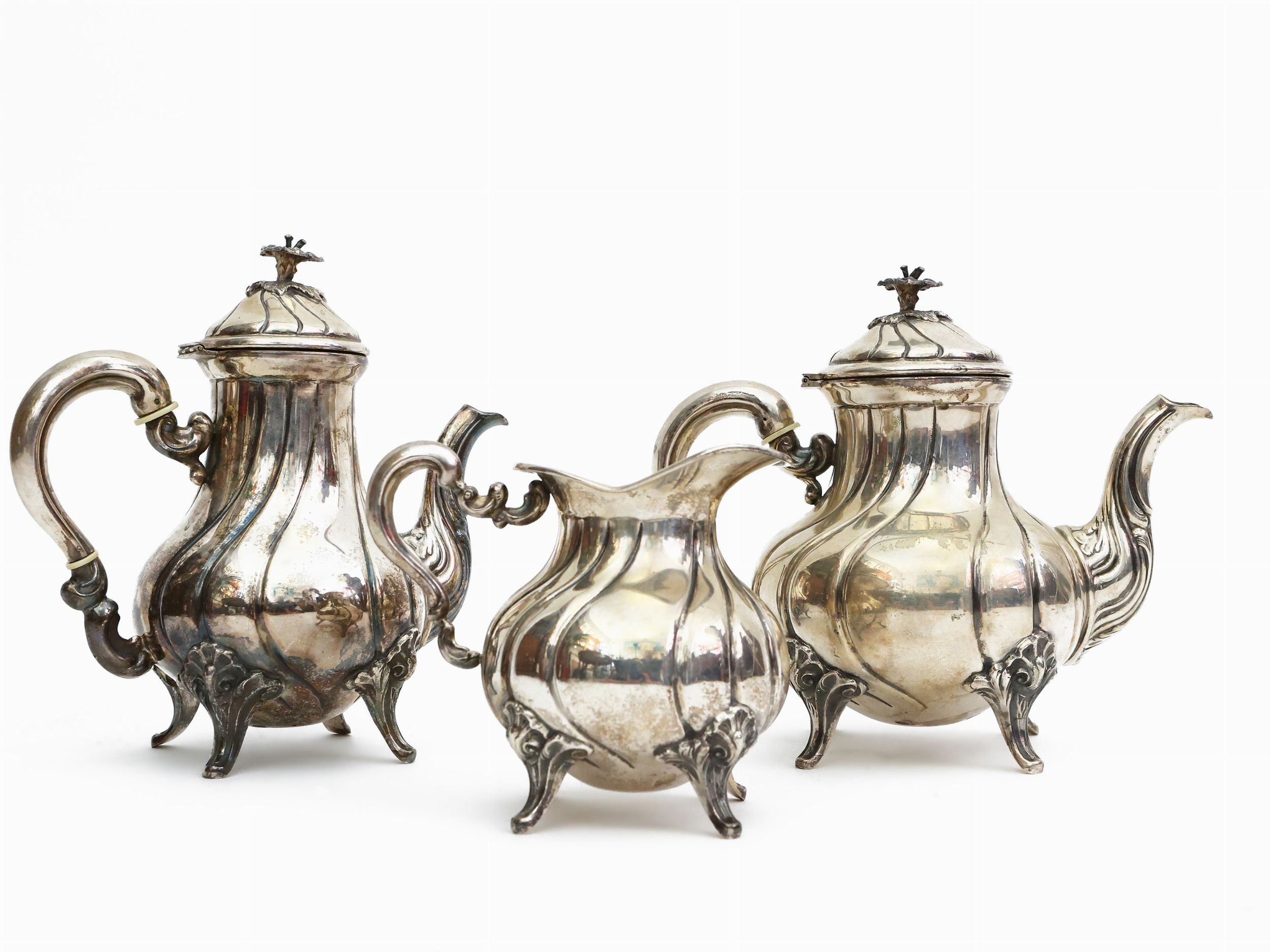 corpo scanalato, anse sinuose e prese a foggia di fiore, composto da teiera, caffettiera e lattiera