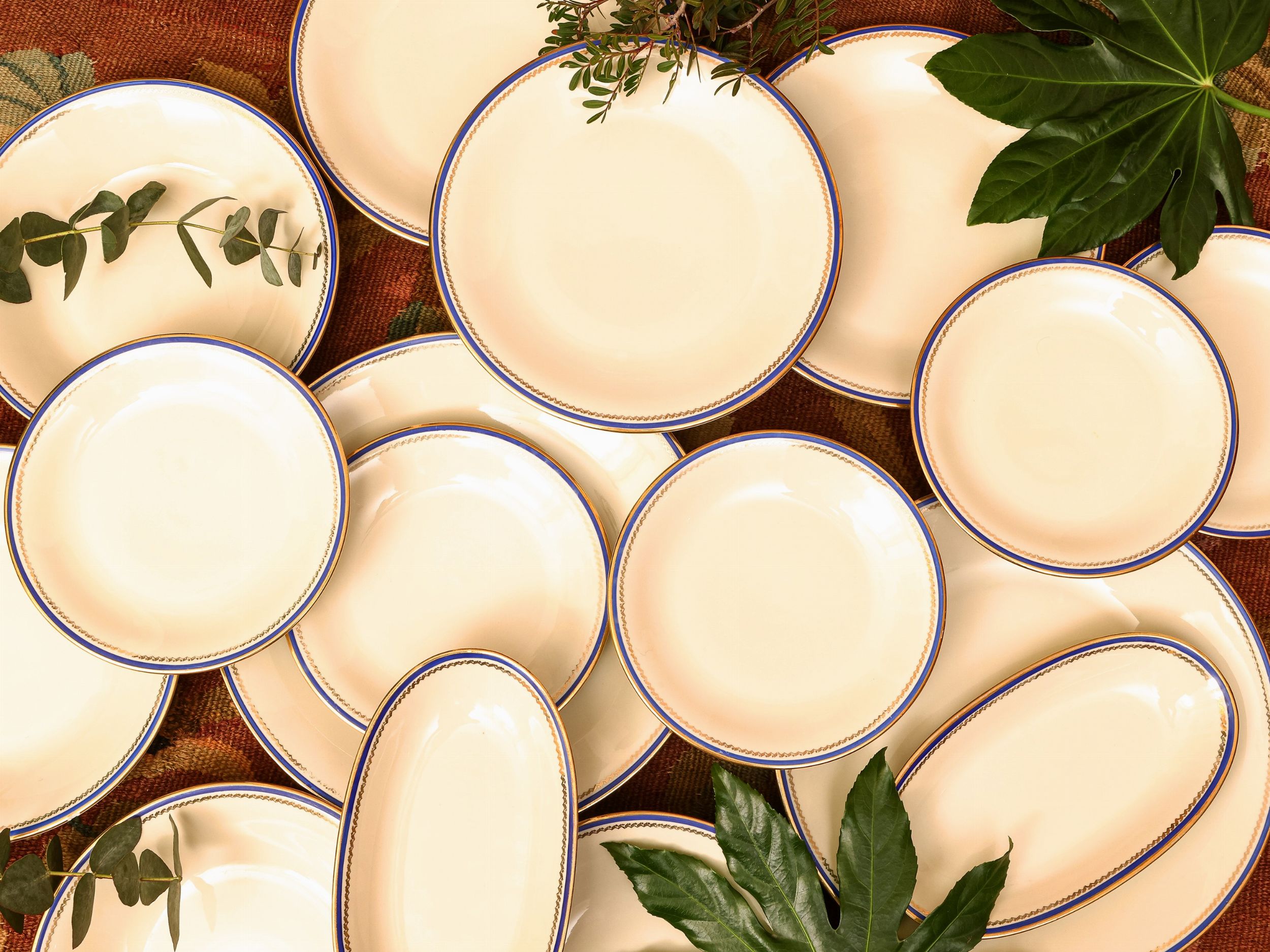 Anni Sessanta bordo con doppia filettatura blu e oro, completo per 12 persone, composto da 12 piati piani, 12 fondi, 9 da frutta, due vassoi rotondi, due ovali, due insalatiere, zuppiera e coppia di raviere, alcuni difetti (42)