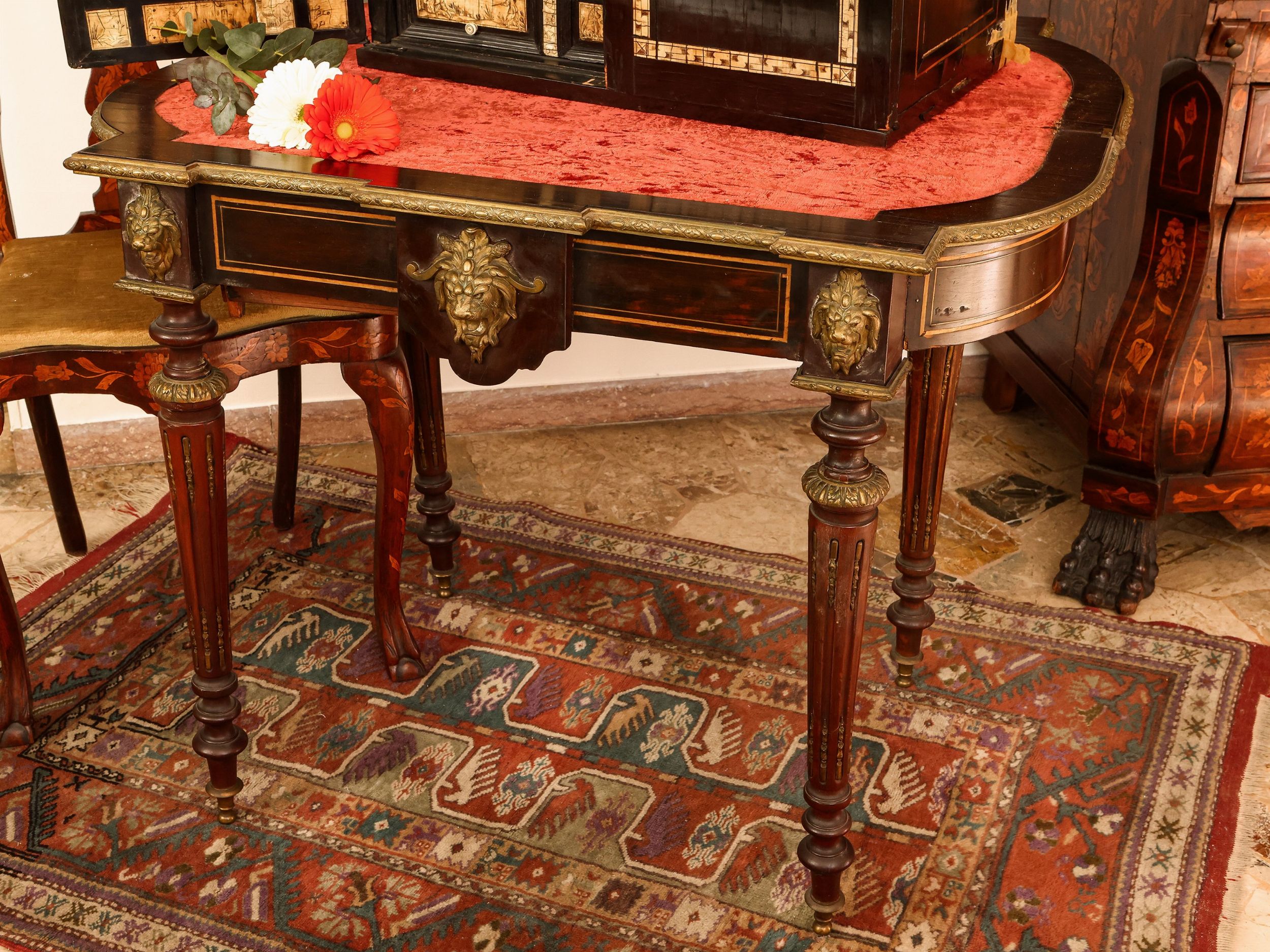 seconda metà del XIX secolo piano sagomato a libro, intarsiato in ottone con motivi neoclassici, all'interno rivestito in velluto rosso, applicazioni in bronzo con teste di leone, gambe scanalate, alcuni difetti