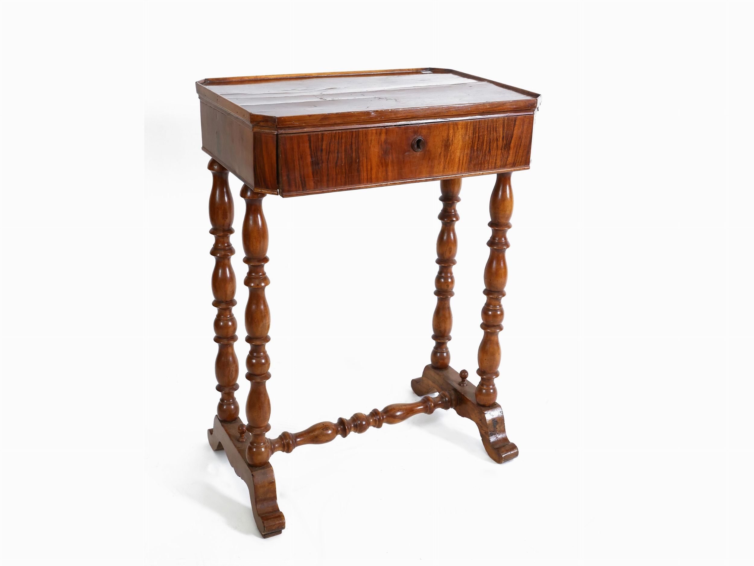 metà del XIX secolo un cassetto nella fascia, doppi sostegni torniti riuniti da traversa su piede sagomato, difetti