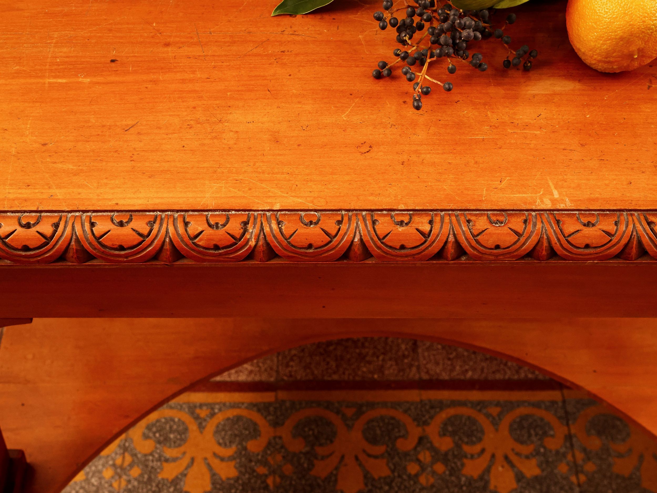 inizio del XX secolo piano rettangolare con bordo intagliato con motivo di mezzi rosoni, quattro gambe svasate riunte da ripiano sagomato