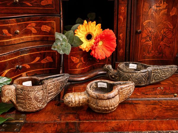Tre antiche lucerne zoomorfe in pietra saponaria