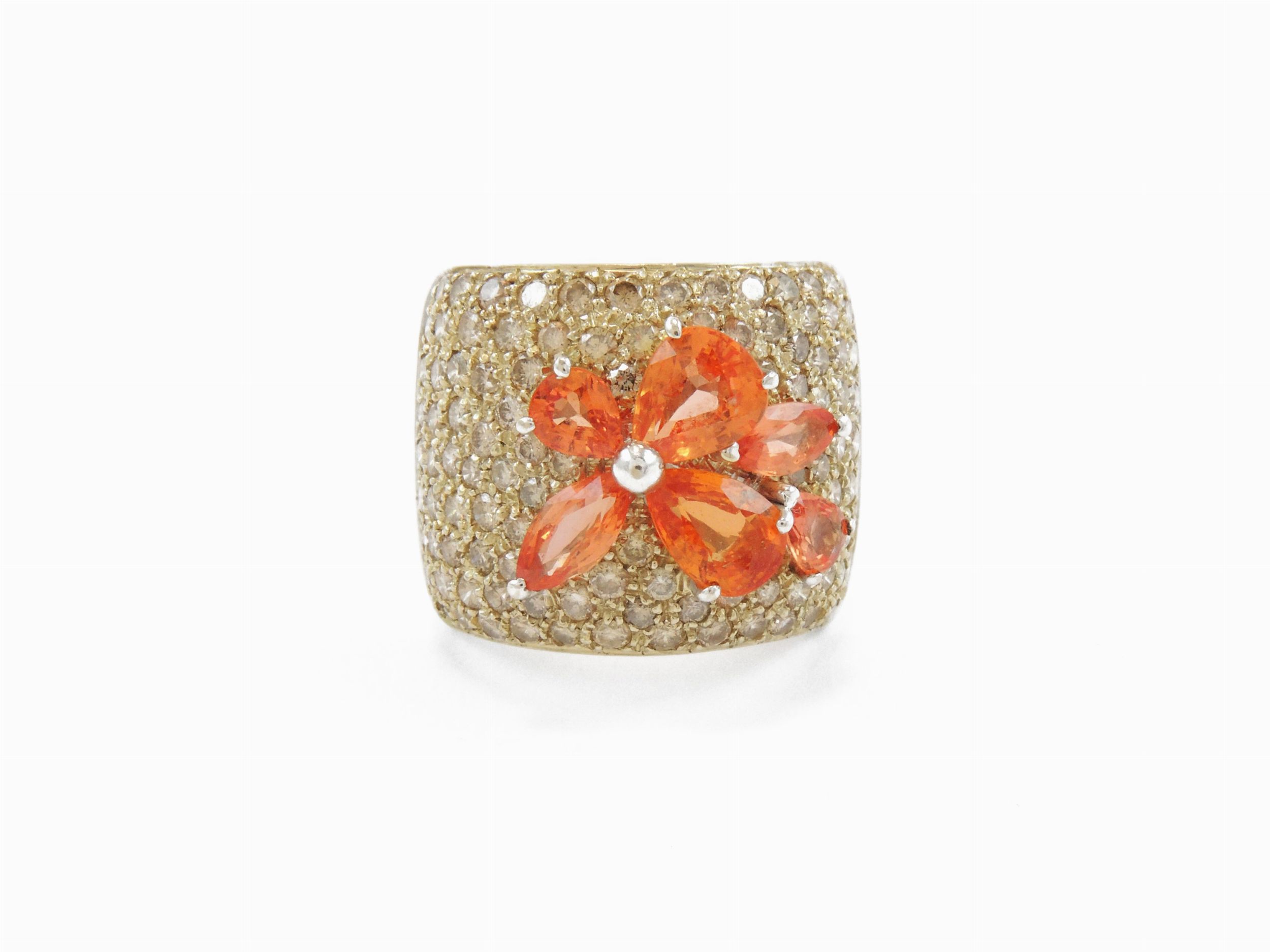 Anello a fascia in oro bianco con diamanti brown e zaffiri arancio