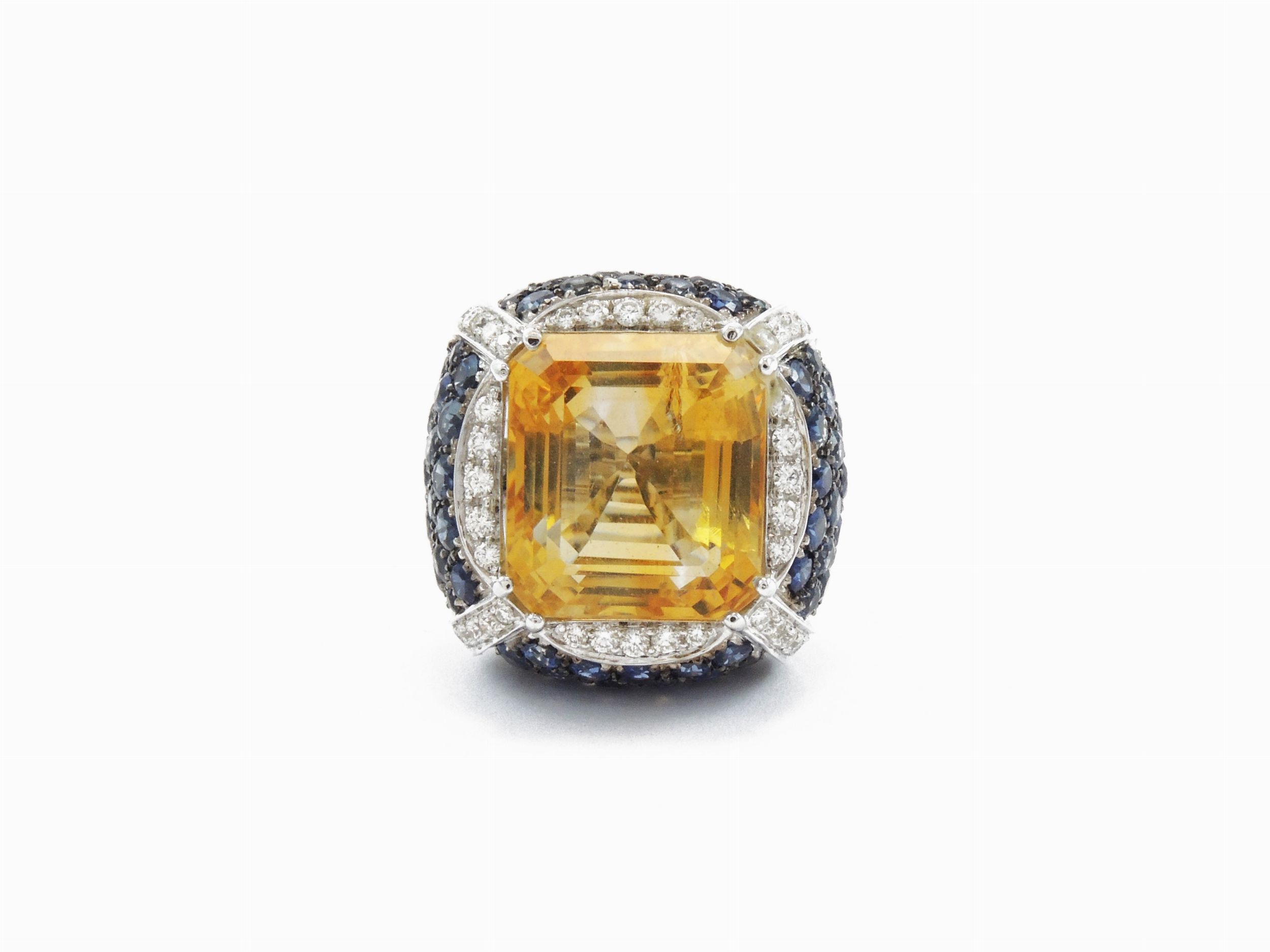 Anello da cocktail in oro bianco con diamanti, zaffiri e quarzo citrino