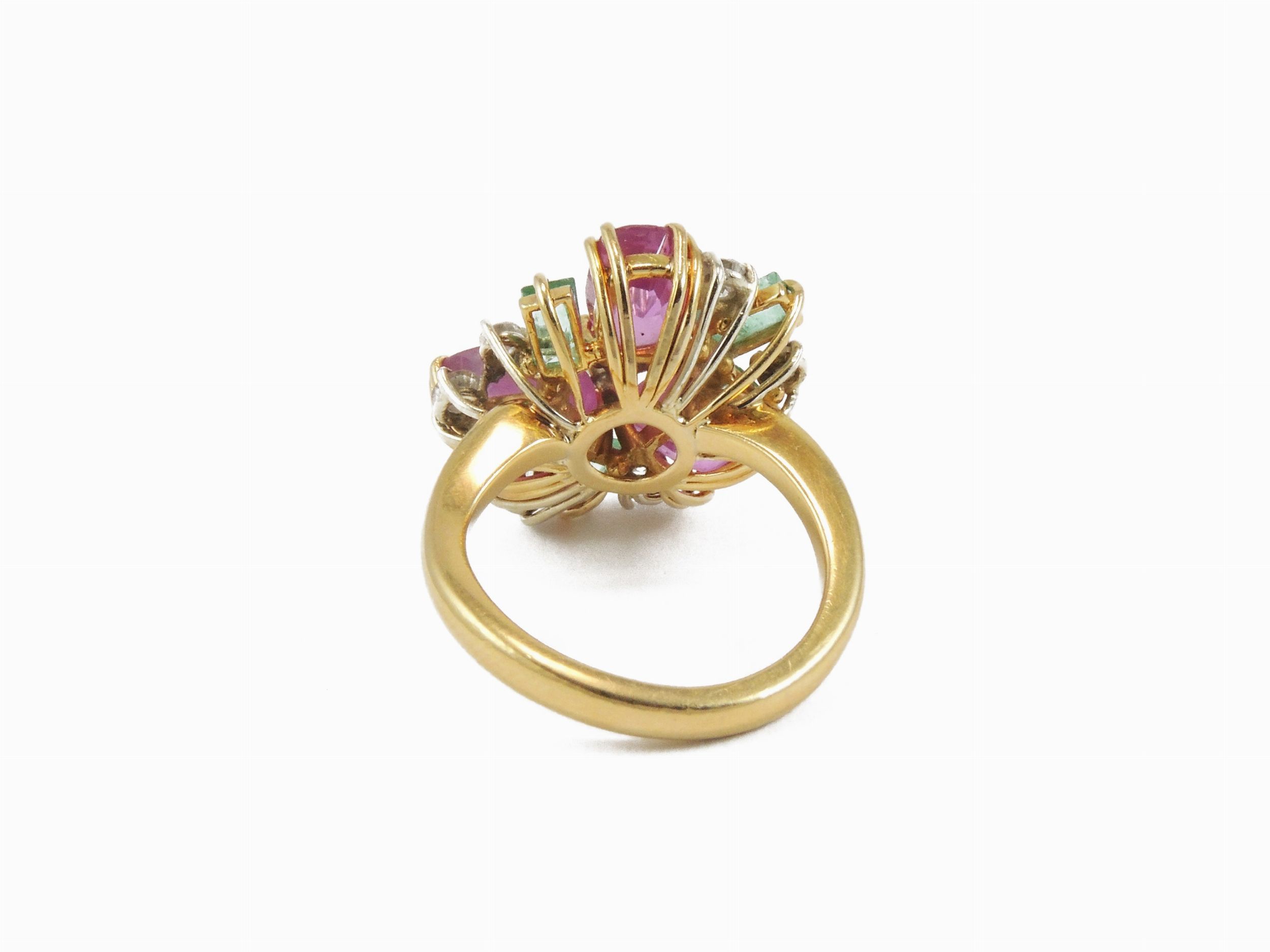 Anello in oro giallo con diamanti, corindoni rosa e smeraldi