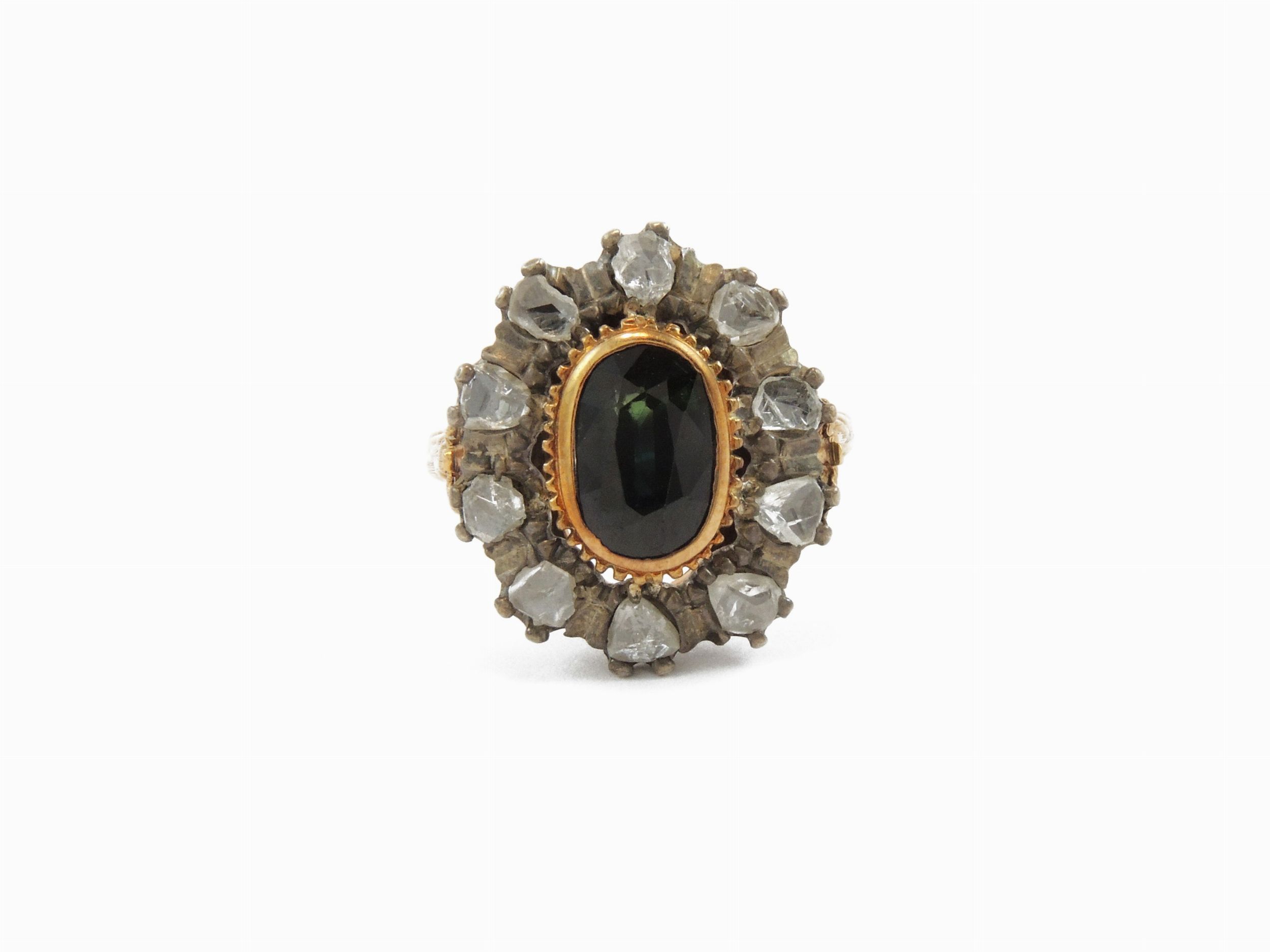 Anello in oro giallo e argento con diamanti e zaffiro