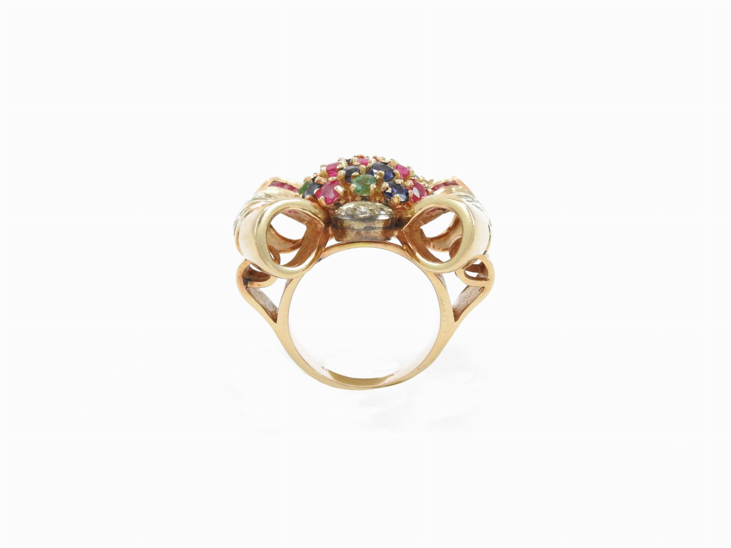 Anello in oro rosa 585/1000 con diamanti, rubini, zaffiri e smeraldi