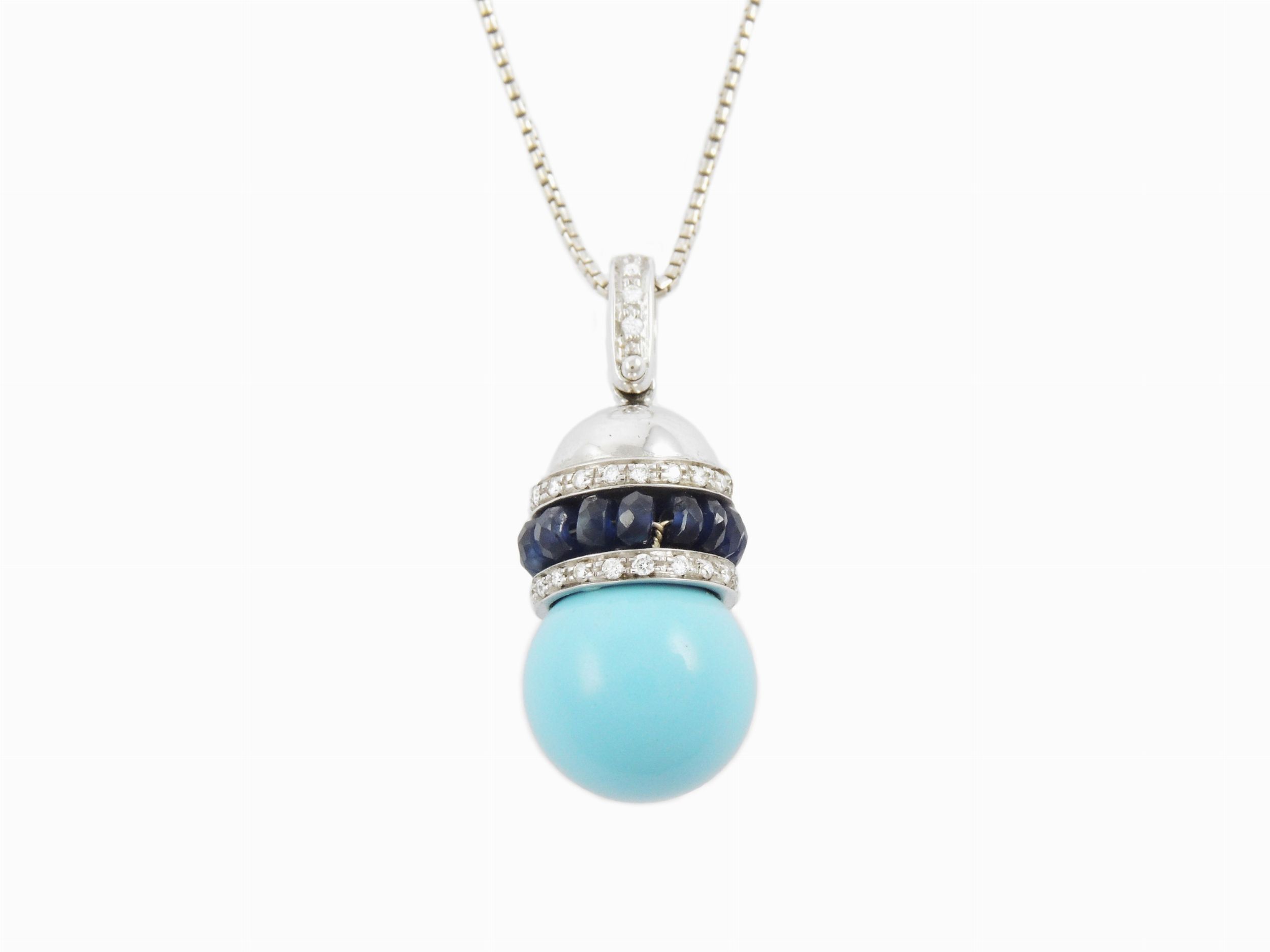 Catenina e pendente in oro bianco con diamanti, zaffiri e turchese