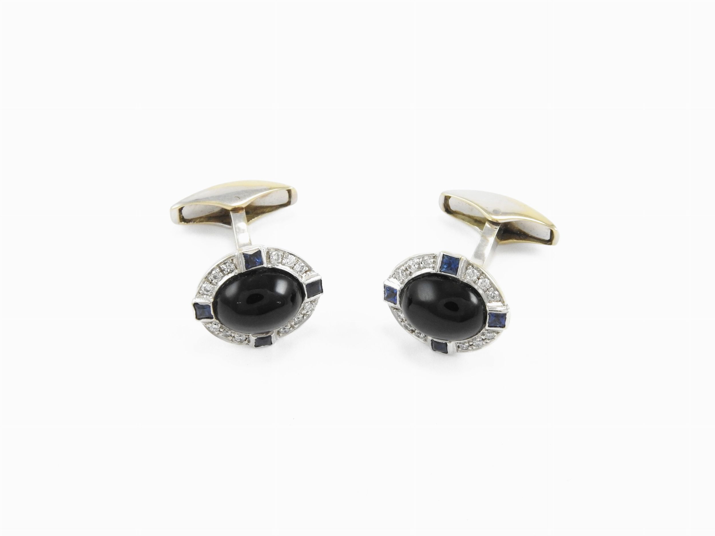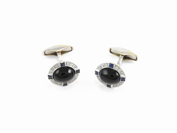 Coppia di gemelli in oro bianco con diamanti, zaffiri e onice