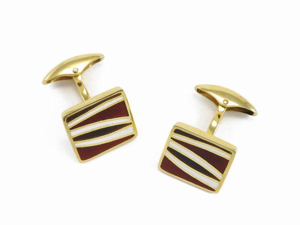 Coppia di gemelli in oro giallo con smalti rossi e bianchi