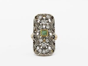 Anello in oro giallo e argeno con diamanti e smeraldo