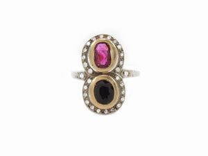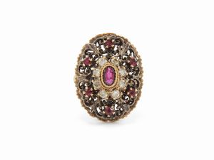 Anello in oro giallo e argento con diamanti e rubini