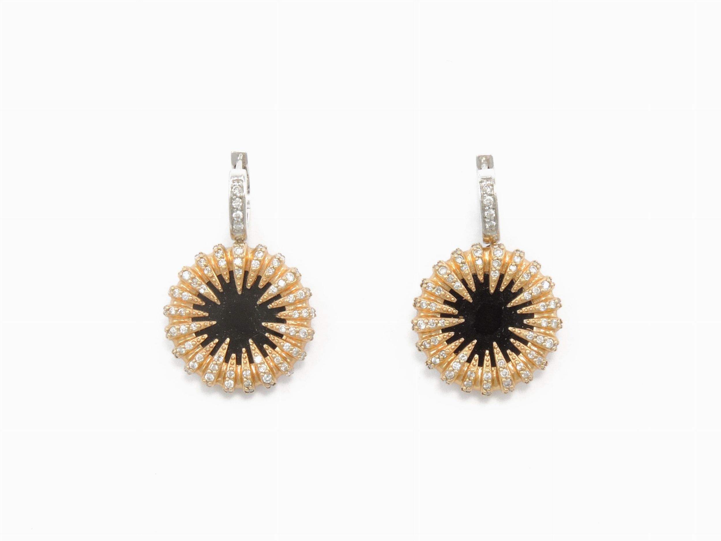Orecchini pendenti in oro bianco e rosa con diamanti e onici