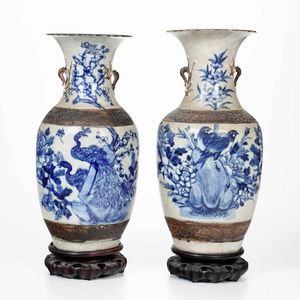 Coppia di vasi in porcellana con piccole anse e raffigurazioni di pavoni entro paesaggio [..]