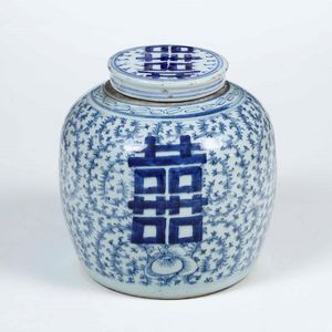 Potiche in porcellana bianca e blu con ideogramma e decori vegetali, Cina, Dinastia [..]