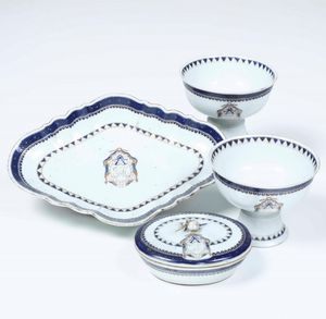 Lotto composto da due coppe, un vassoio e una ciotola con coperchio in porcellana [..]