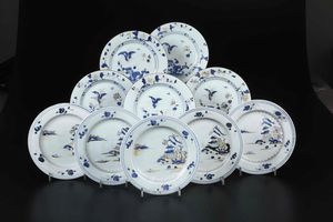 Dieci piatti in porcellana Imari raffiguranti paesaggi e soggetti naturalistici, [..]