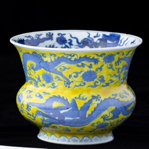 Vaso in porcellana con figure di draghi e decori vegetali sui toni del blu su fondo [..]