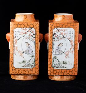 Coppia di vasi Cong in porcellana con mascheroni e scene di vita comune con iscrizioni [..]