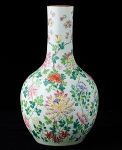 Vaso a bottiglia in porcellana con decoro di peonie in fiore e pipistrelli, Cina, [..]