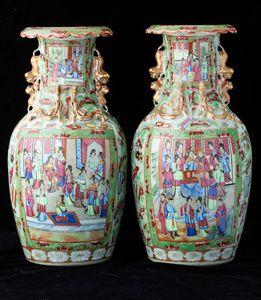 Coppia di vasi in porcellana Famiglia Rosa con scene di vita comune entro riserve, [..]