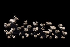 Lotto composto da trentanove figure di animali in argento sbalzato e cesellato, [..]