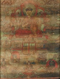 Thangka su seta raffigurante Lama centrale e altre divinità, Tibet, XVII secolo