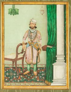 Dipinto su carta raffigurante personaggio in abiti orientali con spada, India, XIX [..]