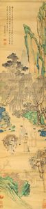 Dipinto su carta raffigurante dignitario con altri personaggi entro paesaggio e [..]