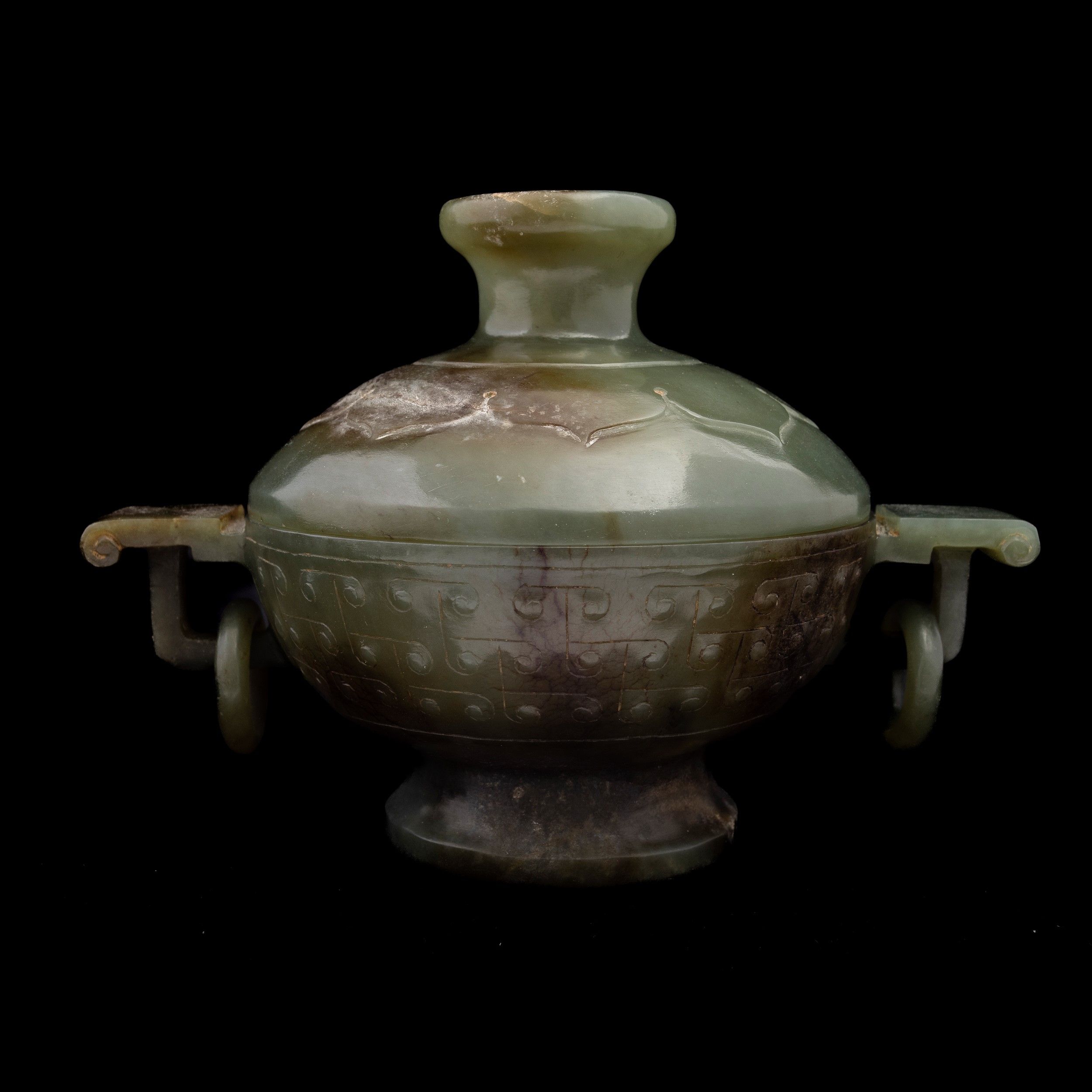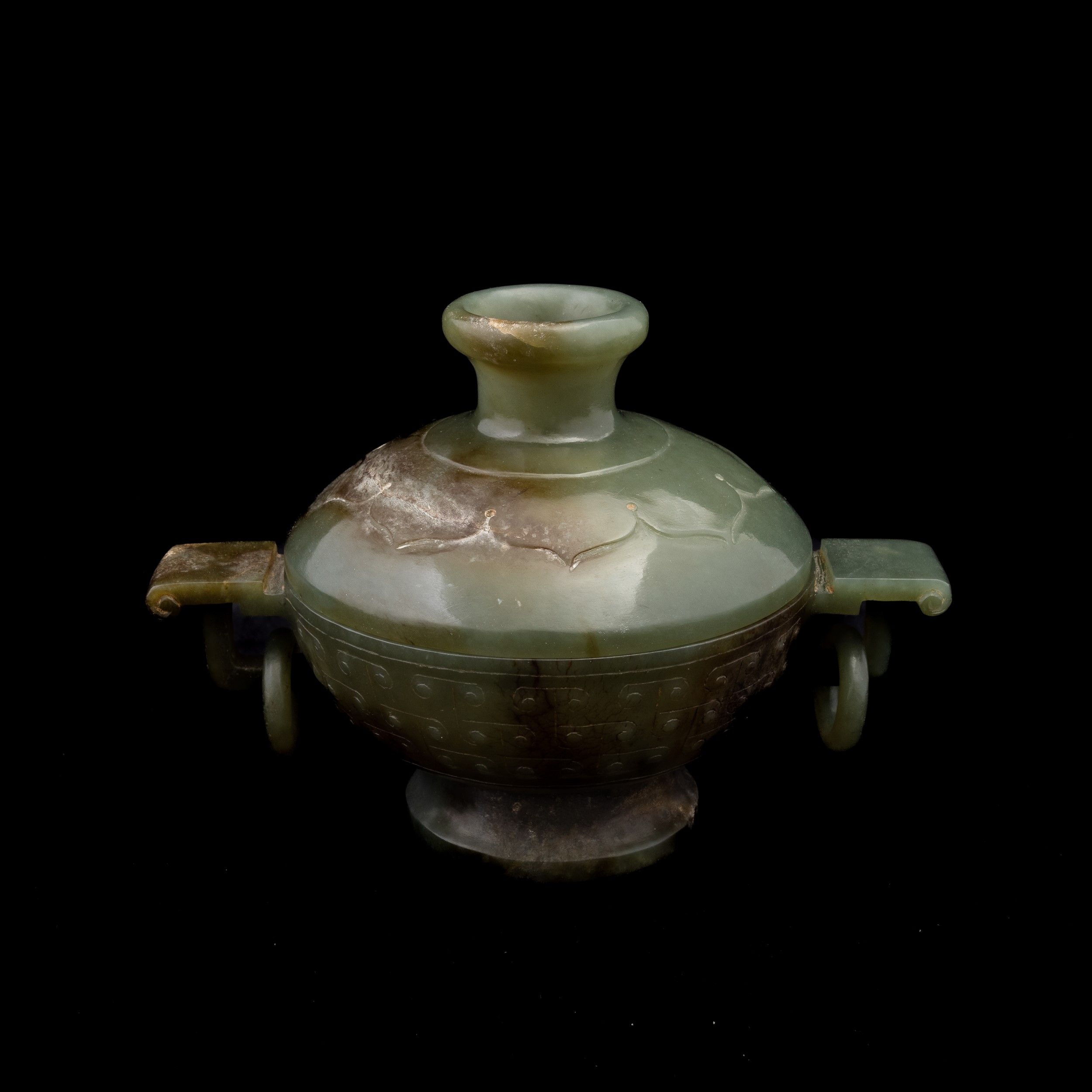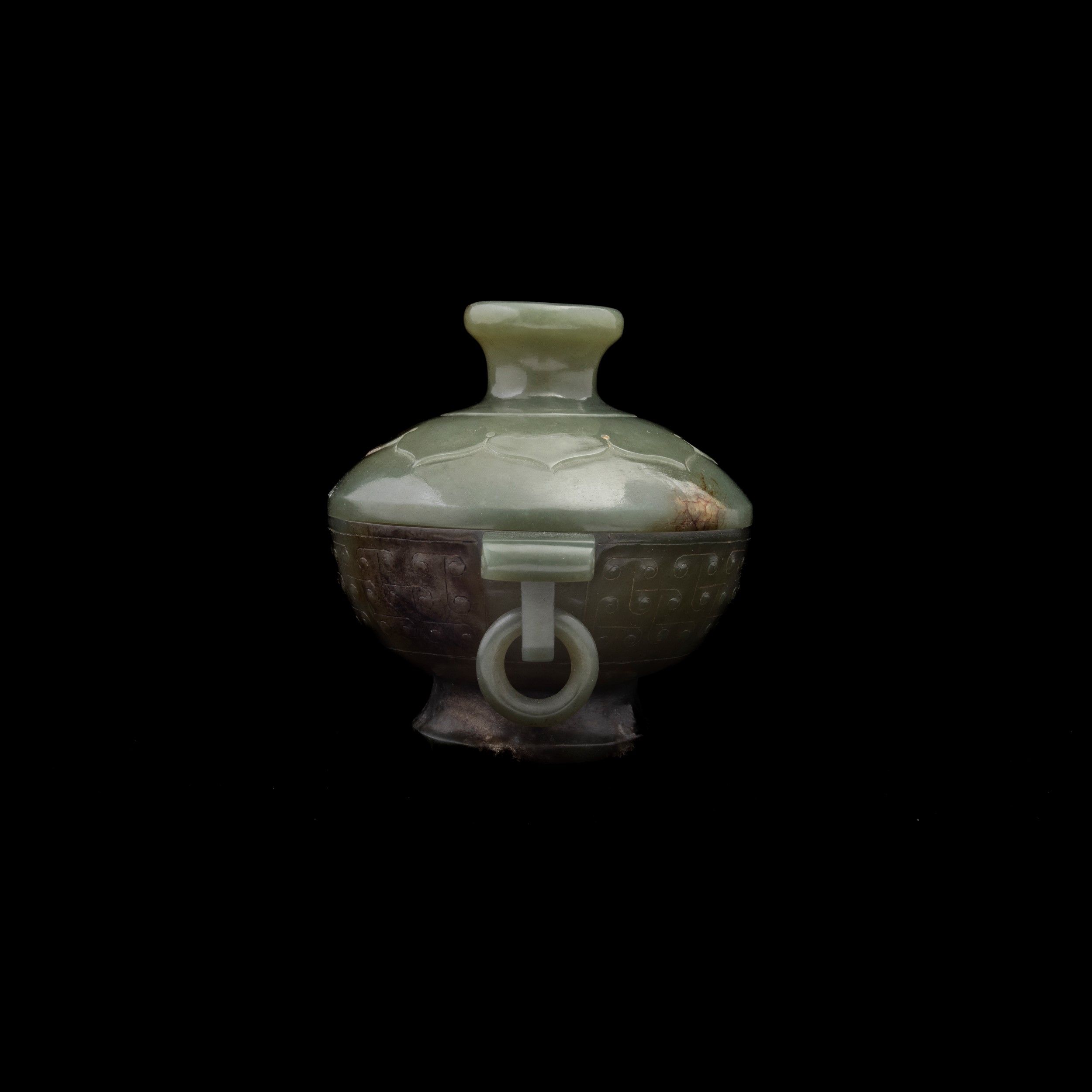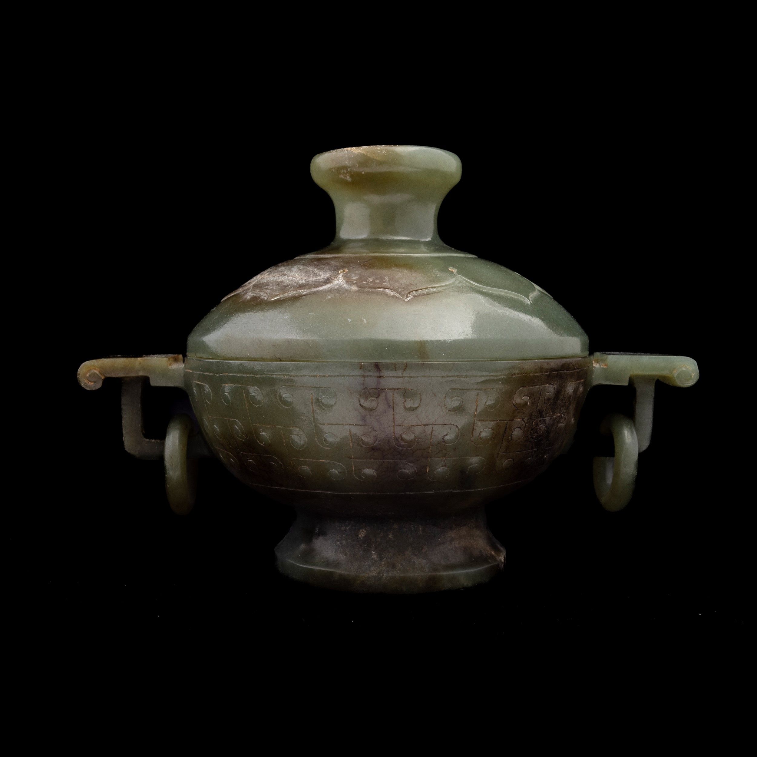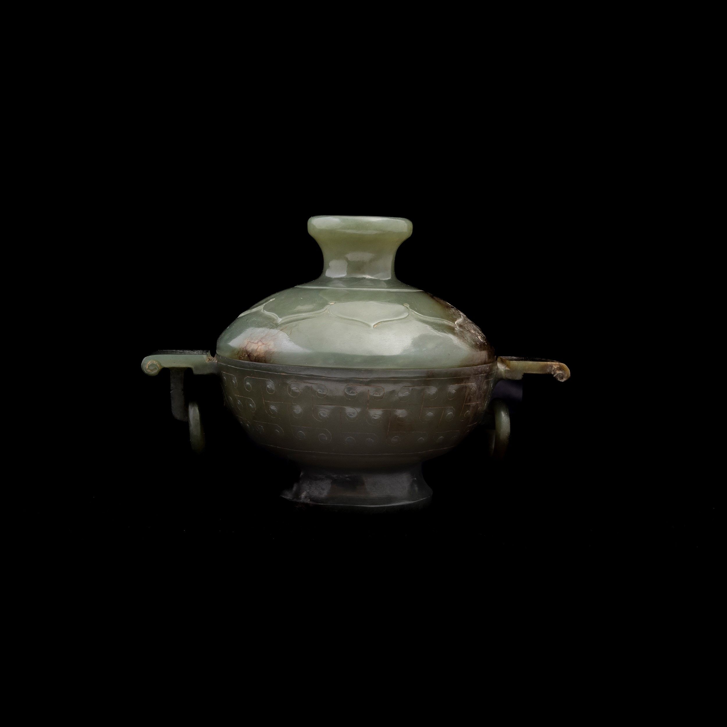Ciotola con coperchio e anse ad anello scolpita in giada e russet con decori a rilievo, [..]
