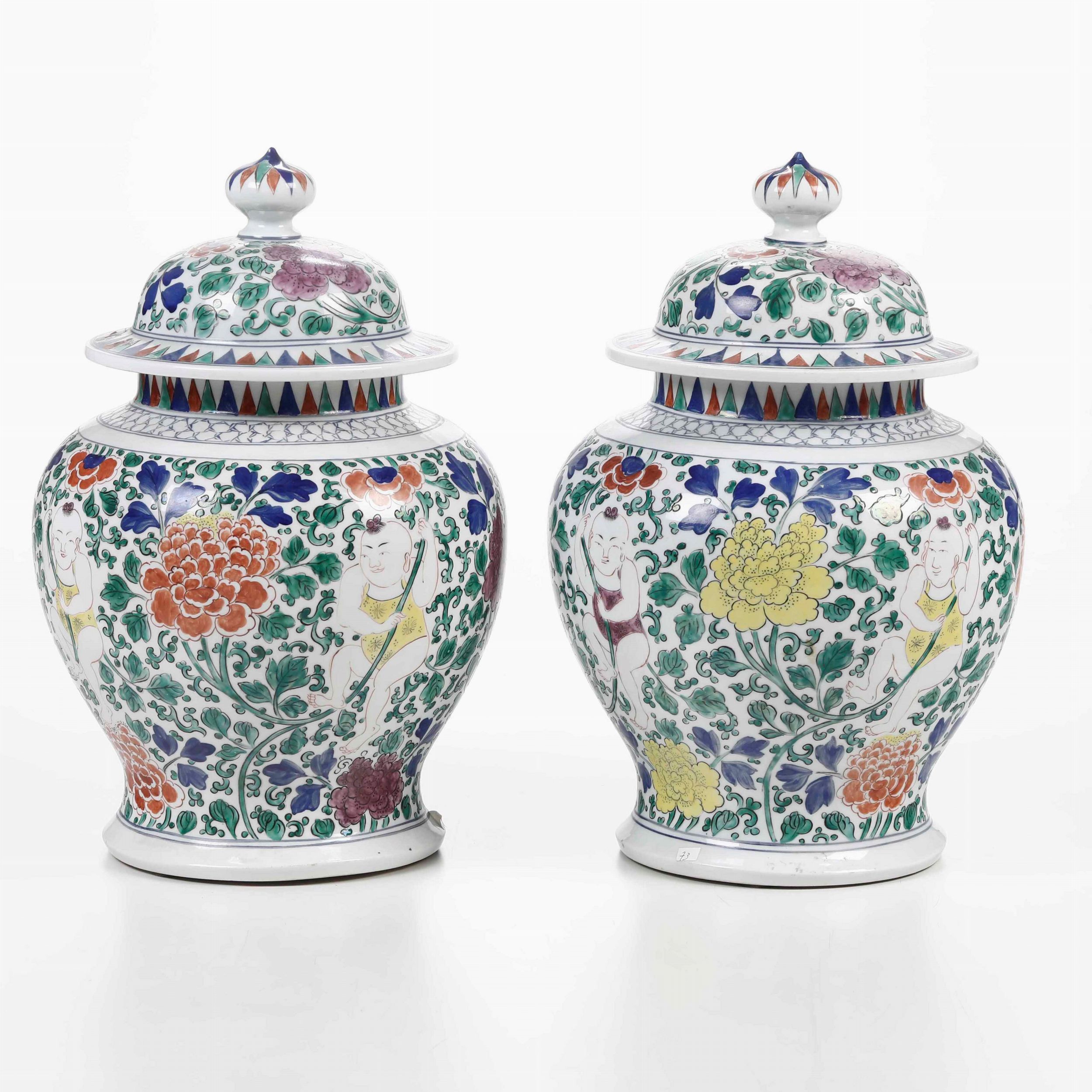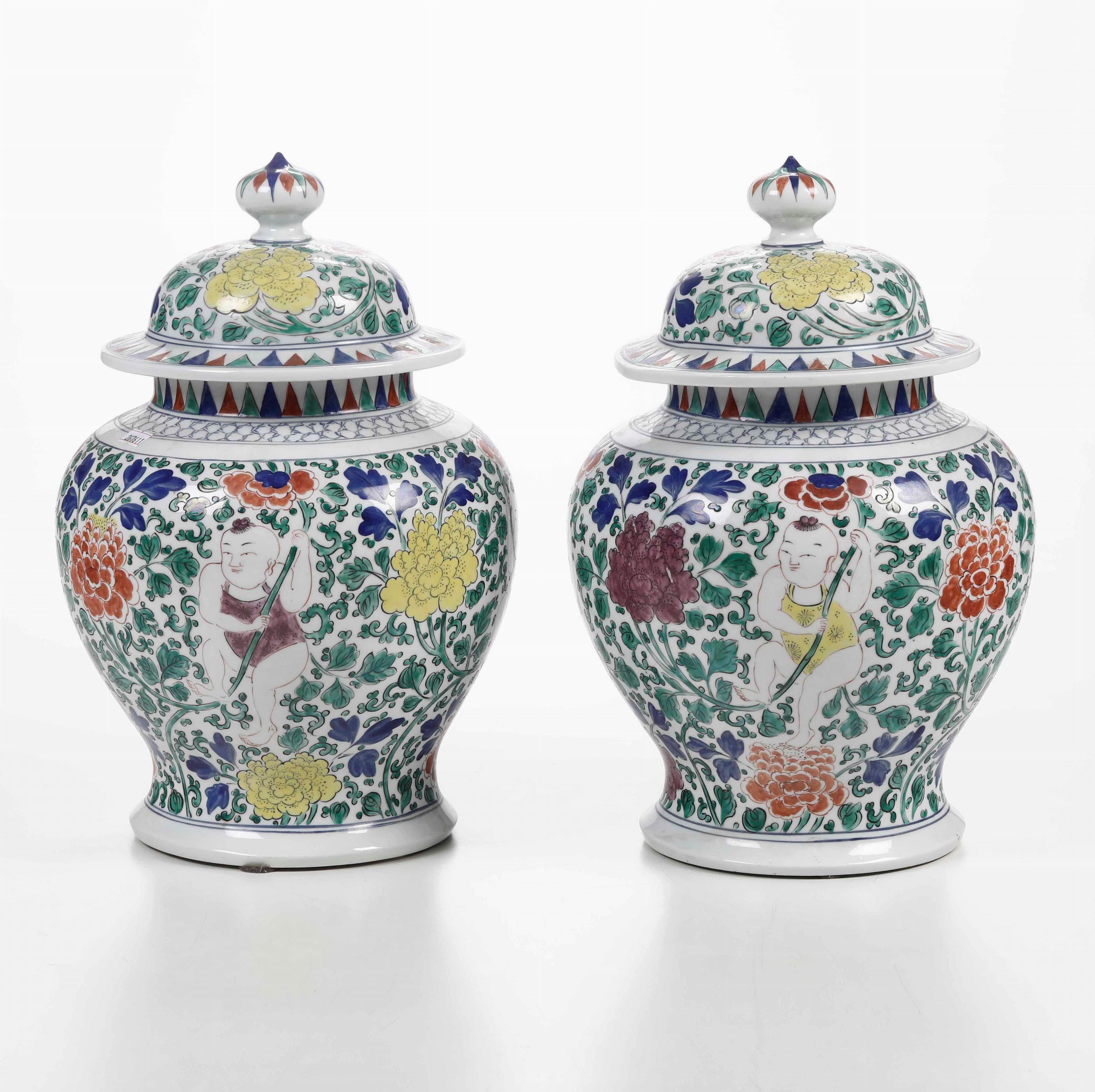 Coppia di potiches in porcellana con figure di bambini e decori floreali, Cina, [..]