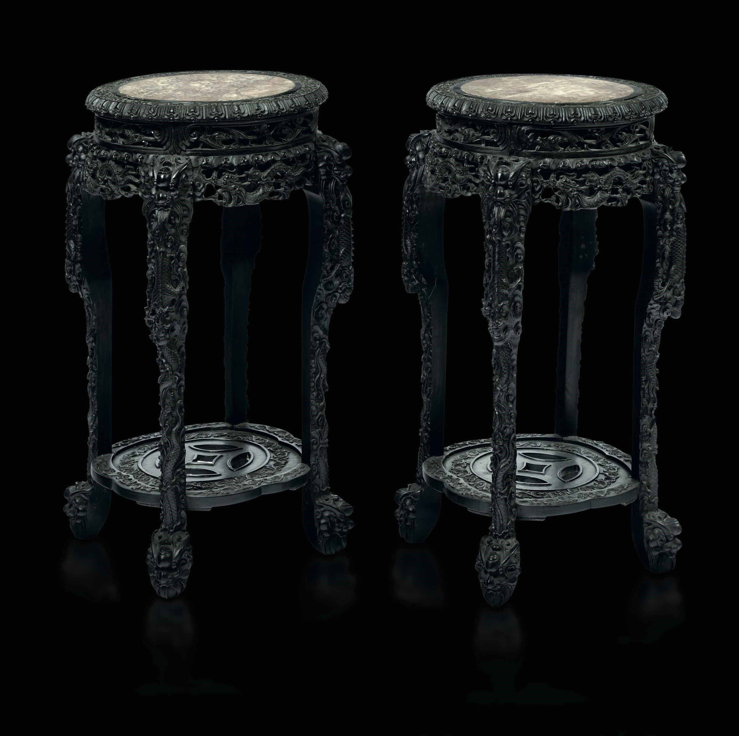 Coppia di tavoli alti in legno intagliato di Homu e piano in marmo, Cina, Dinastia [..]