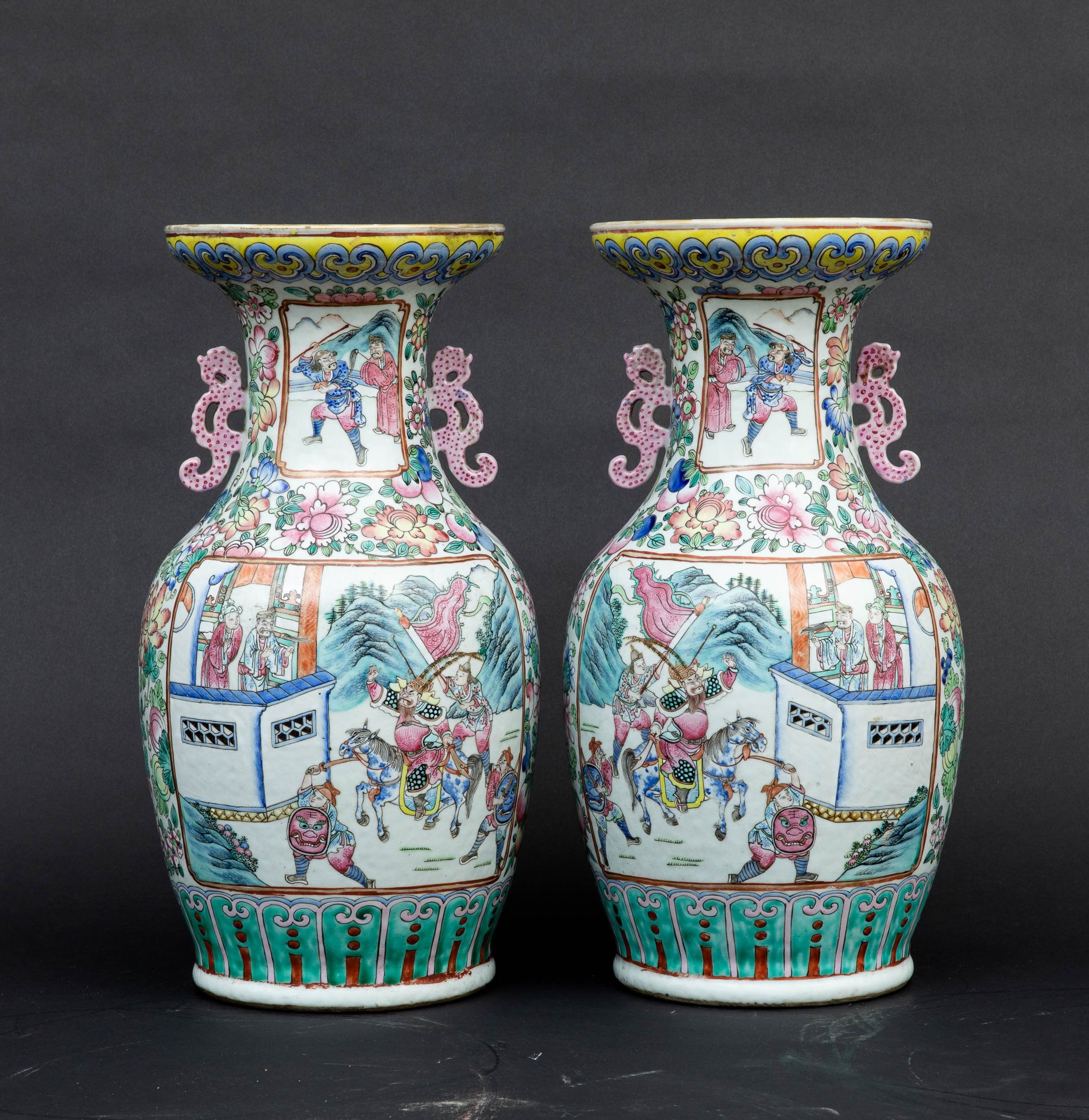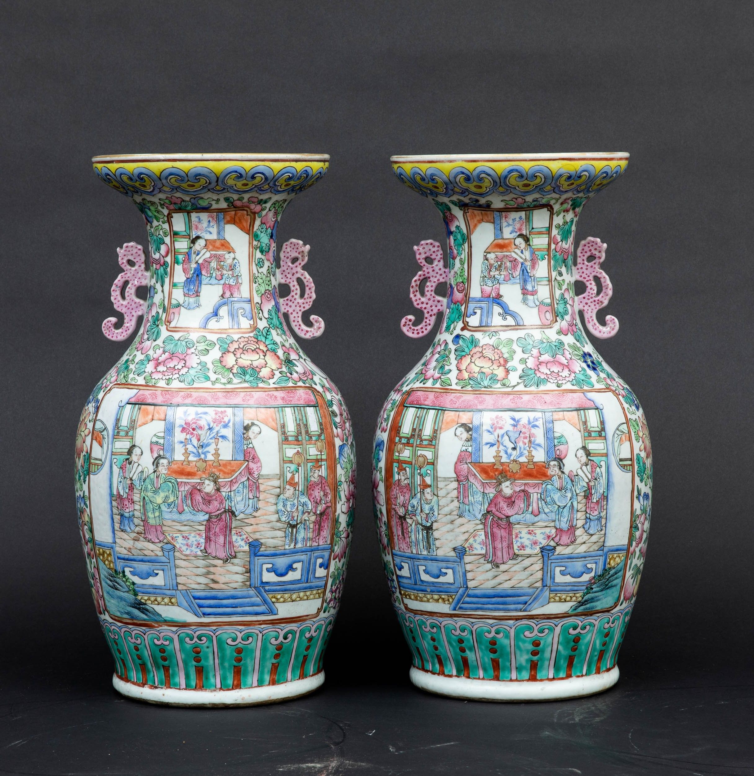Coppia di vasi in porcellana Famiglia Rosa con scene di vita comune entro riserve, [..]