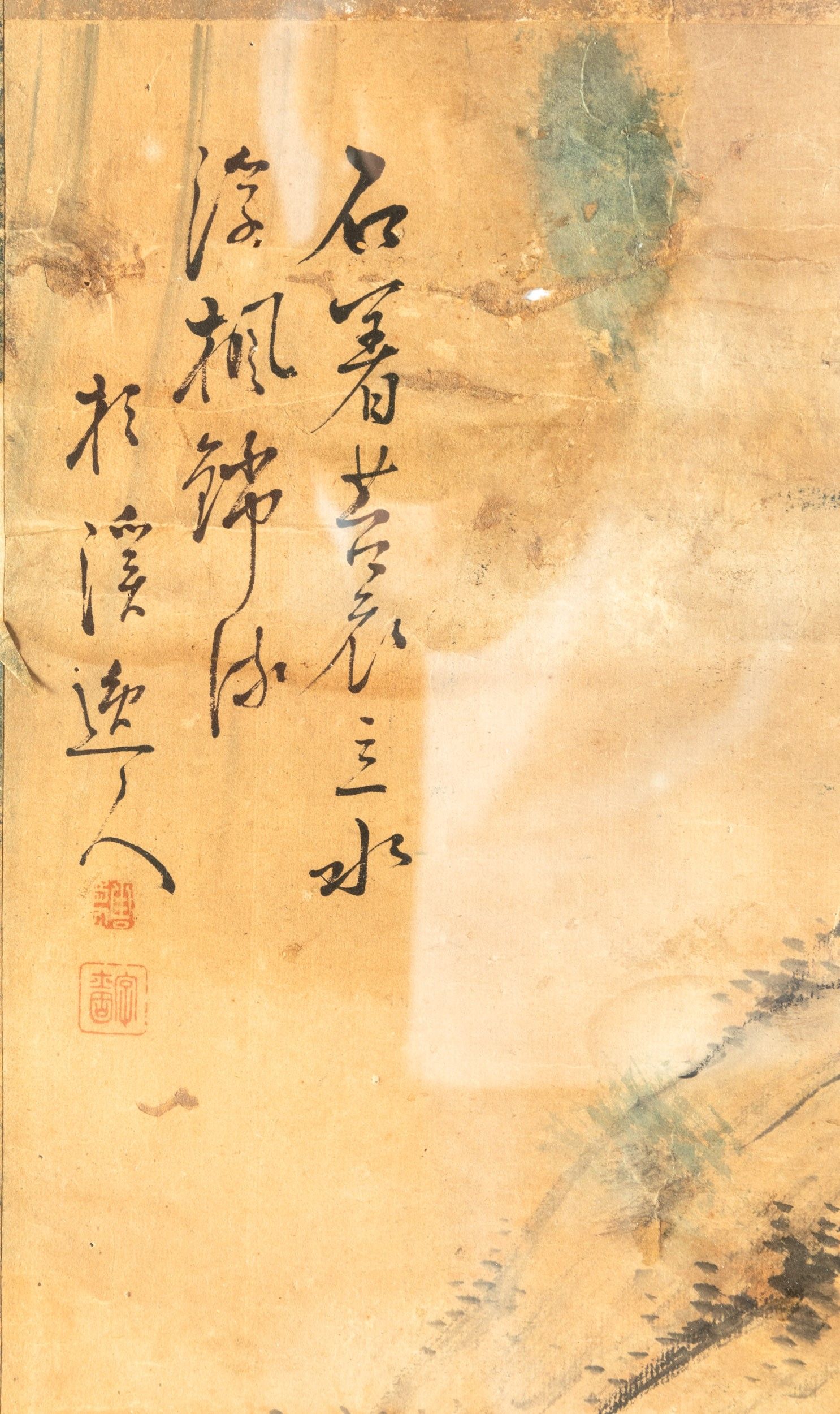 Dipinto su seta raffigurante paesaggio montano con pagoda e iscrizione, Cina, Dinastia [..]