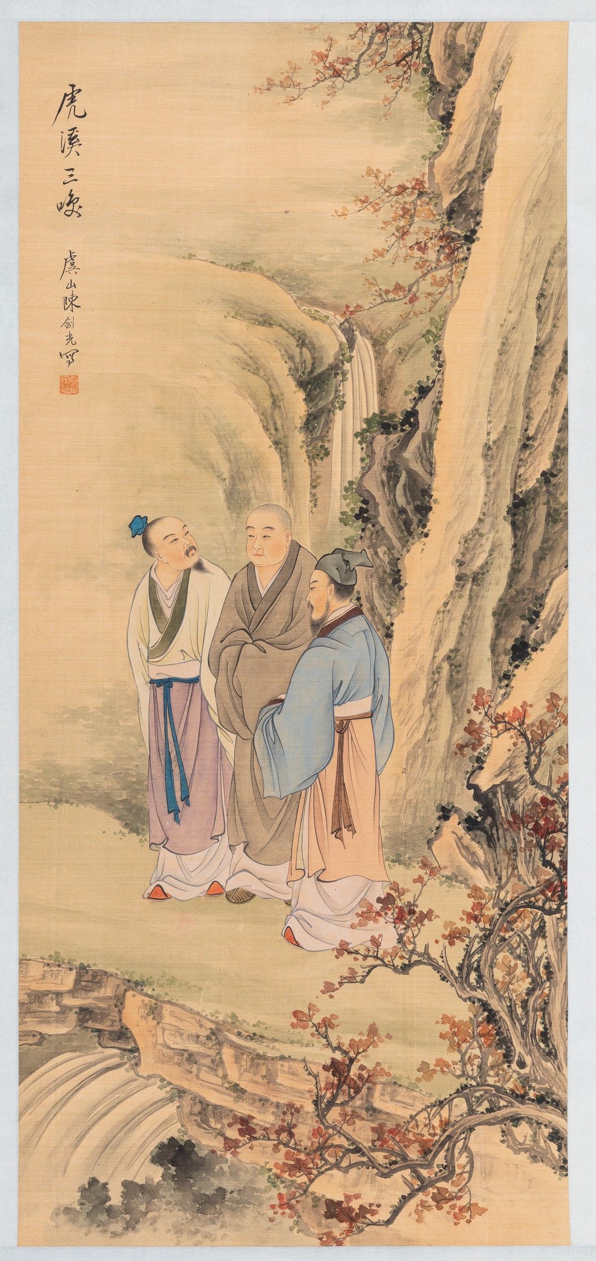 Dipinto su seta raffigurante saggi entro paesaggio con iscrizione, Cina, Dinastia [..]