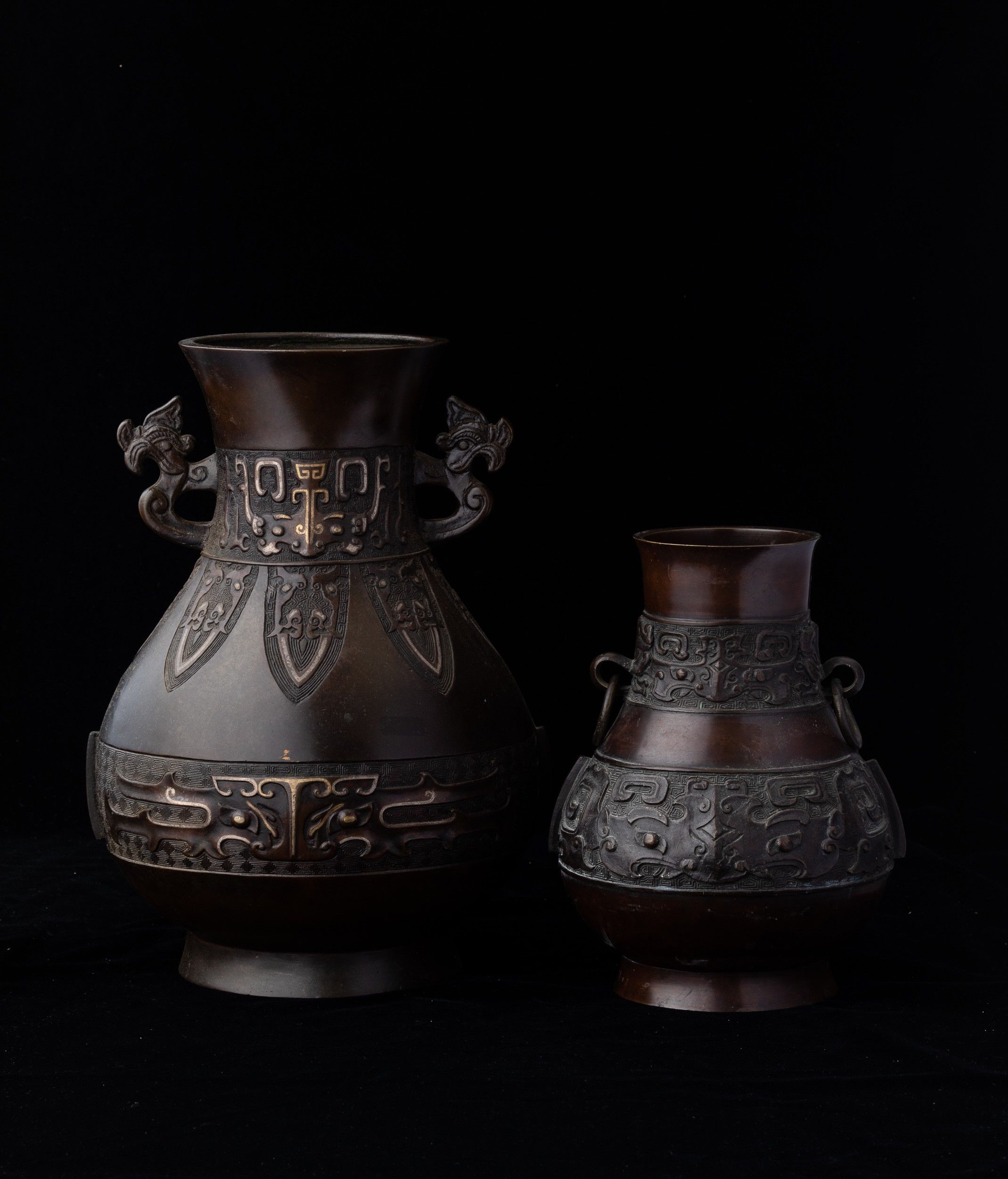 Due vasi in bronzo con anse e decori d'ispirazione arcaica, Cina, Dinastia Qing, [..]