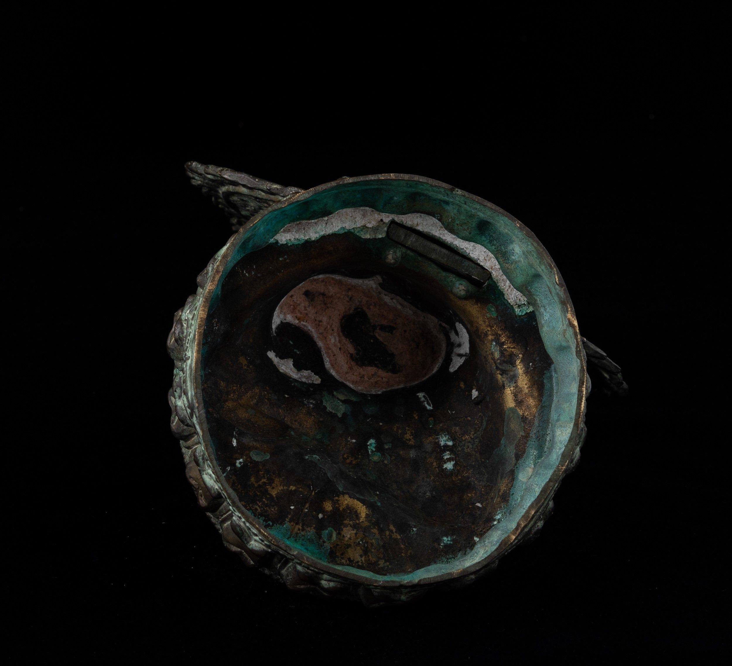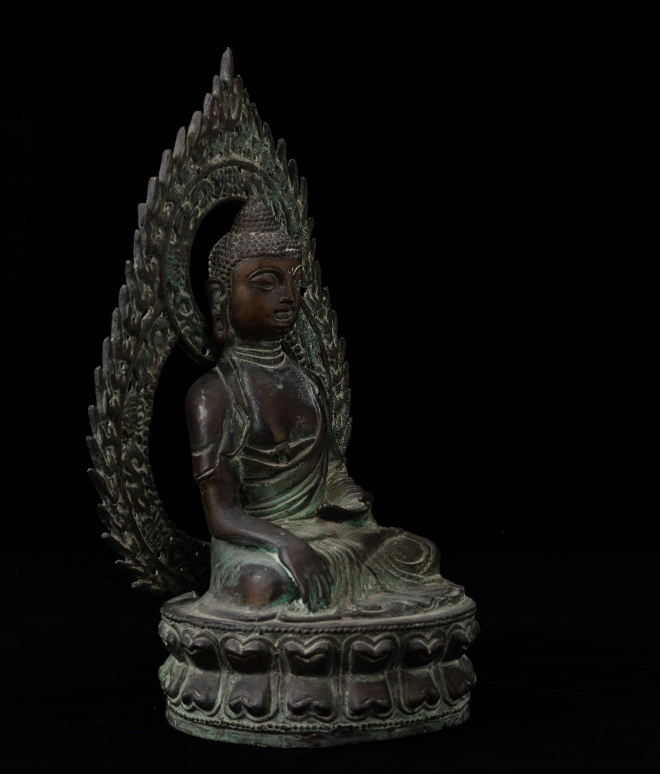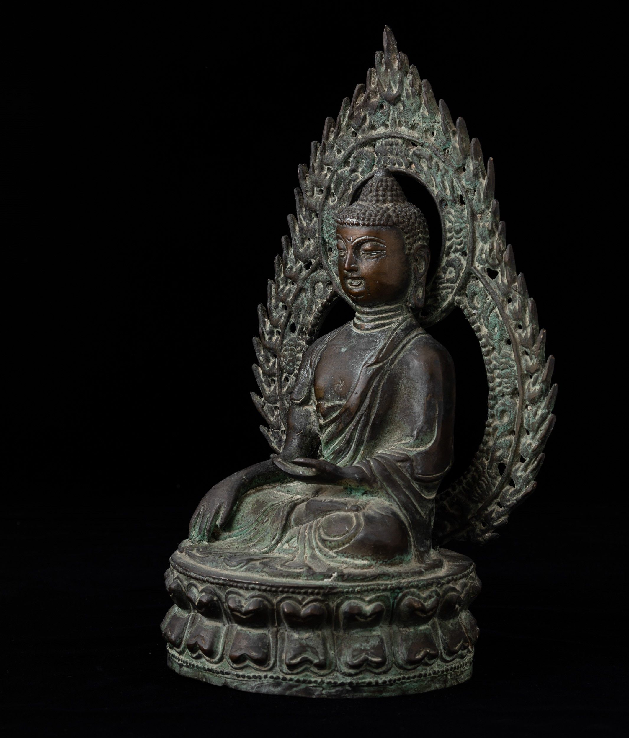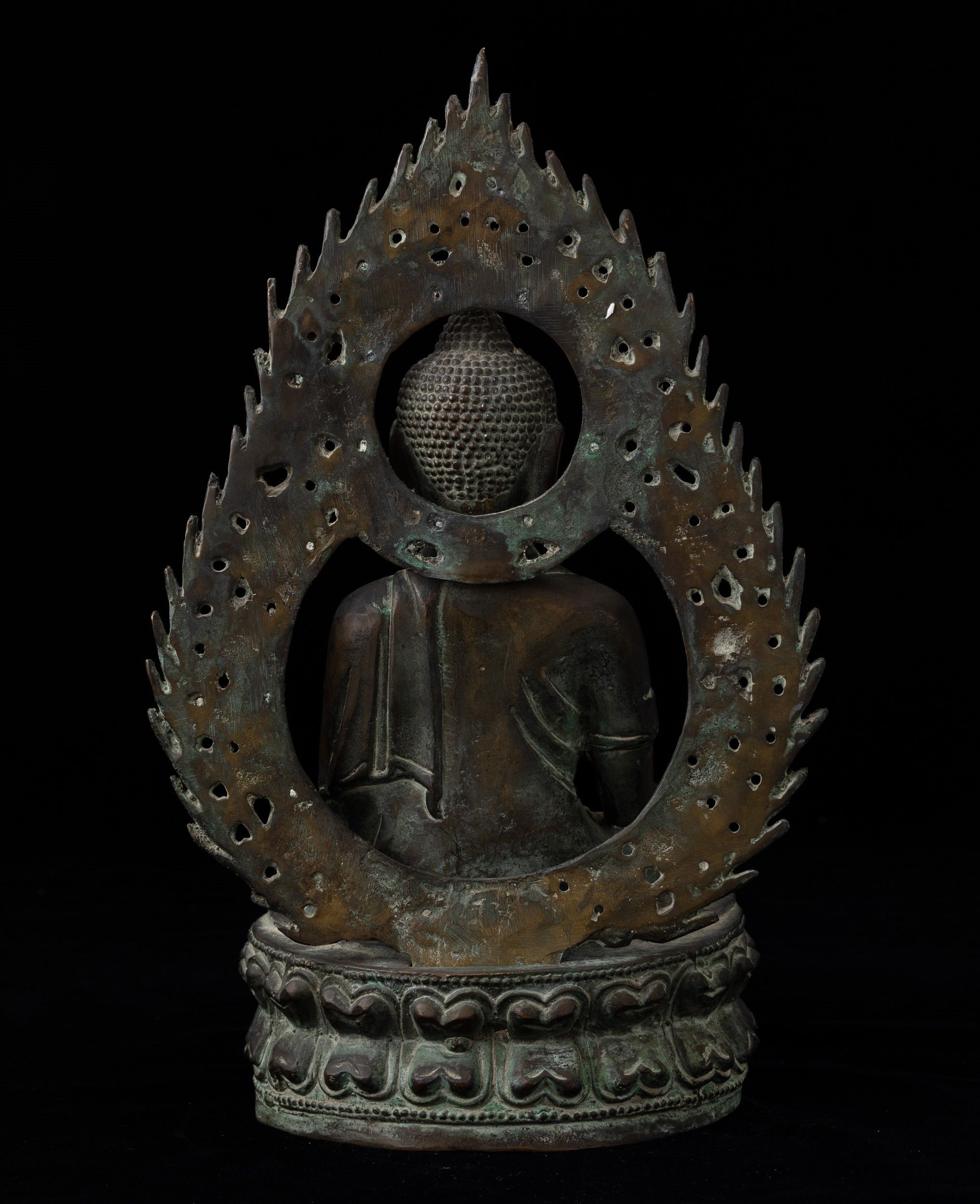 Figura in bronzo di Buddha Sakyamuni seduto su doppio fiore di lotto entro aura, [..]