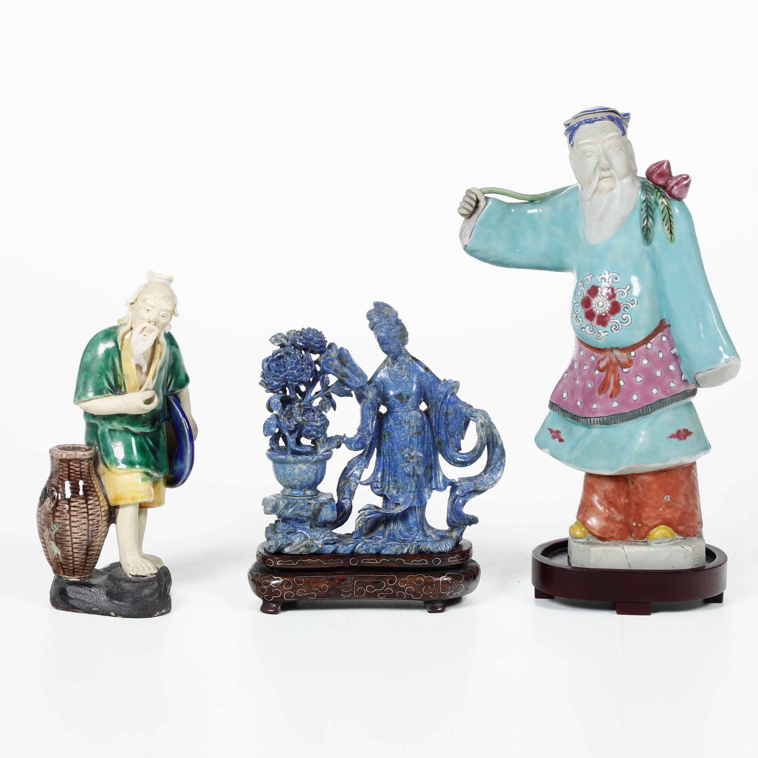 Lotto composto da due figure di saggi in porcellana e una Guanyin in lapislazzulo, [..]