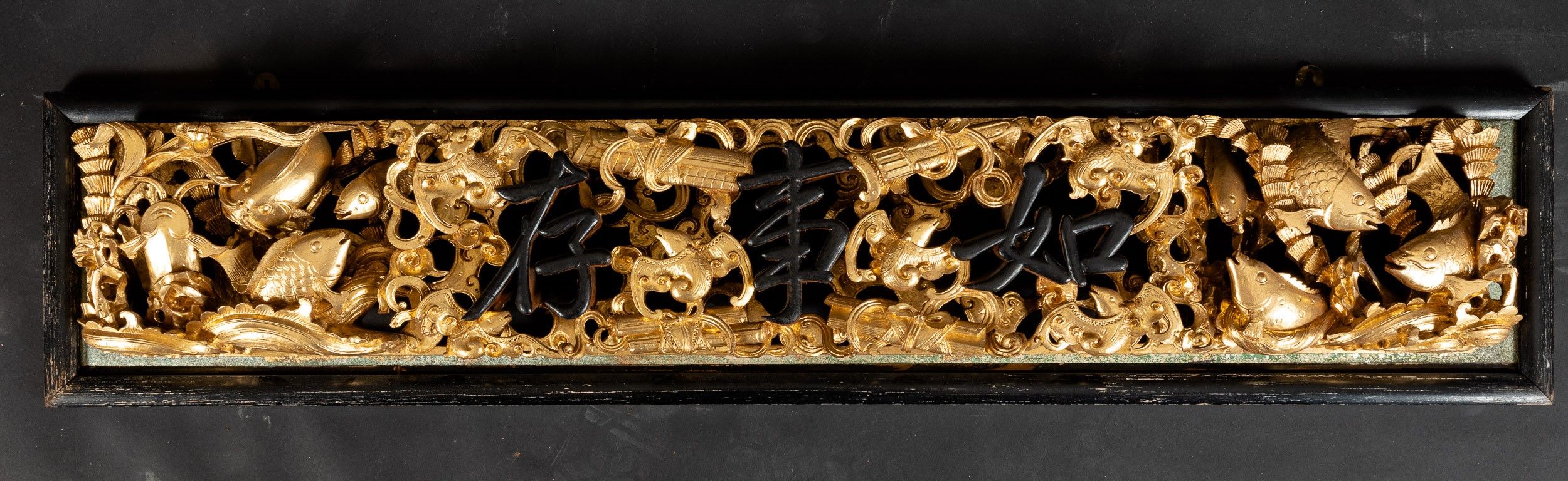 Lotto composto da un pannello in legno laccato e da un fregio in legno intagliato [..]