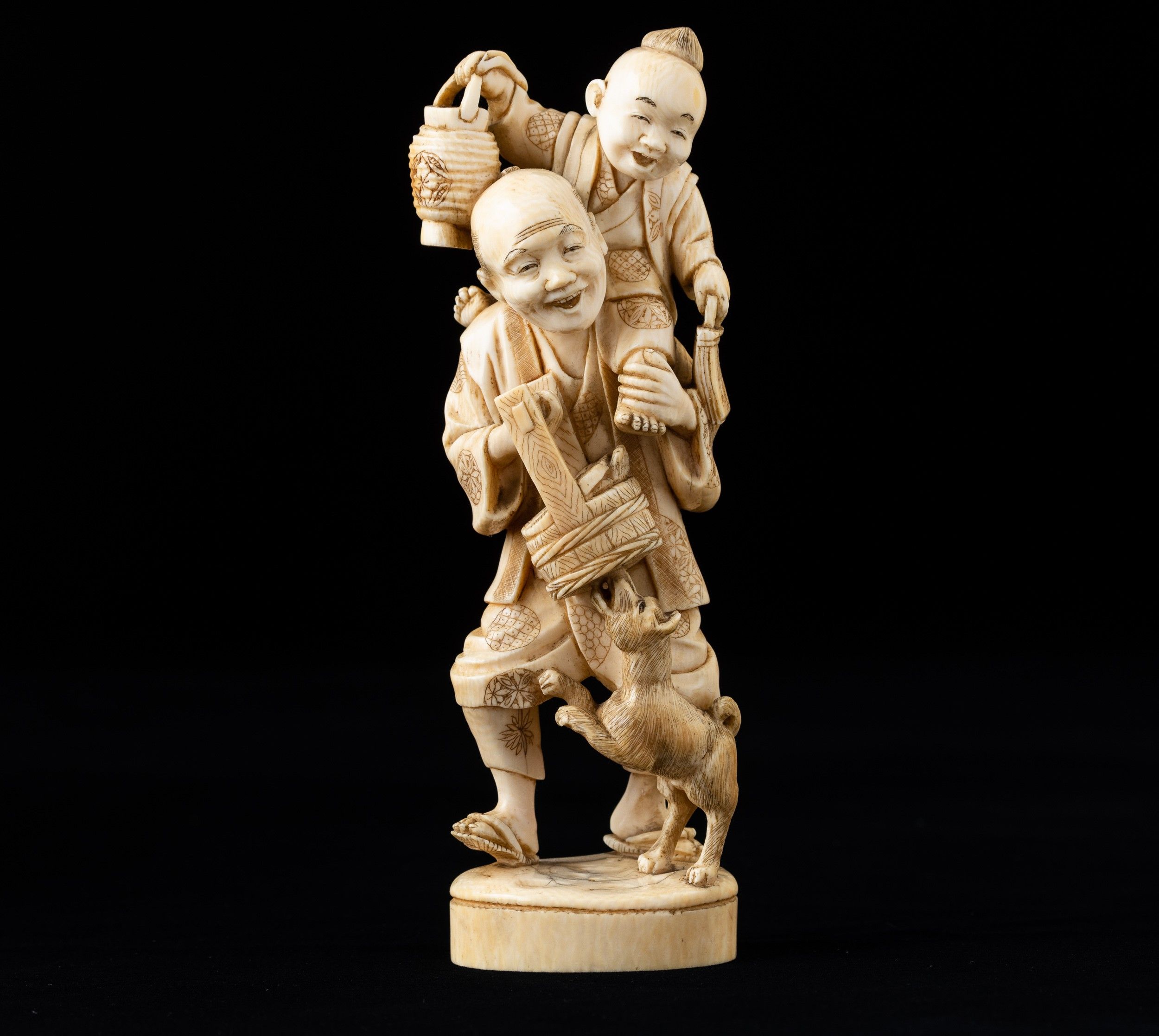Okimono scolpito in avorio raffigurante anziano contadino con bambino e cagnolino, [..]