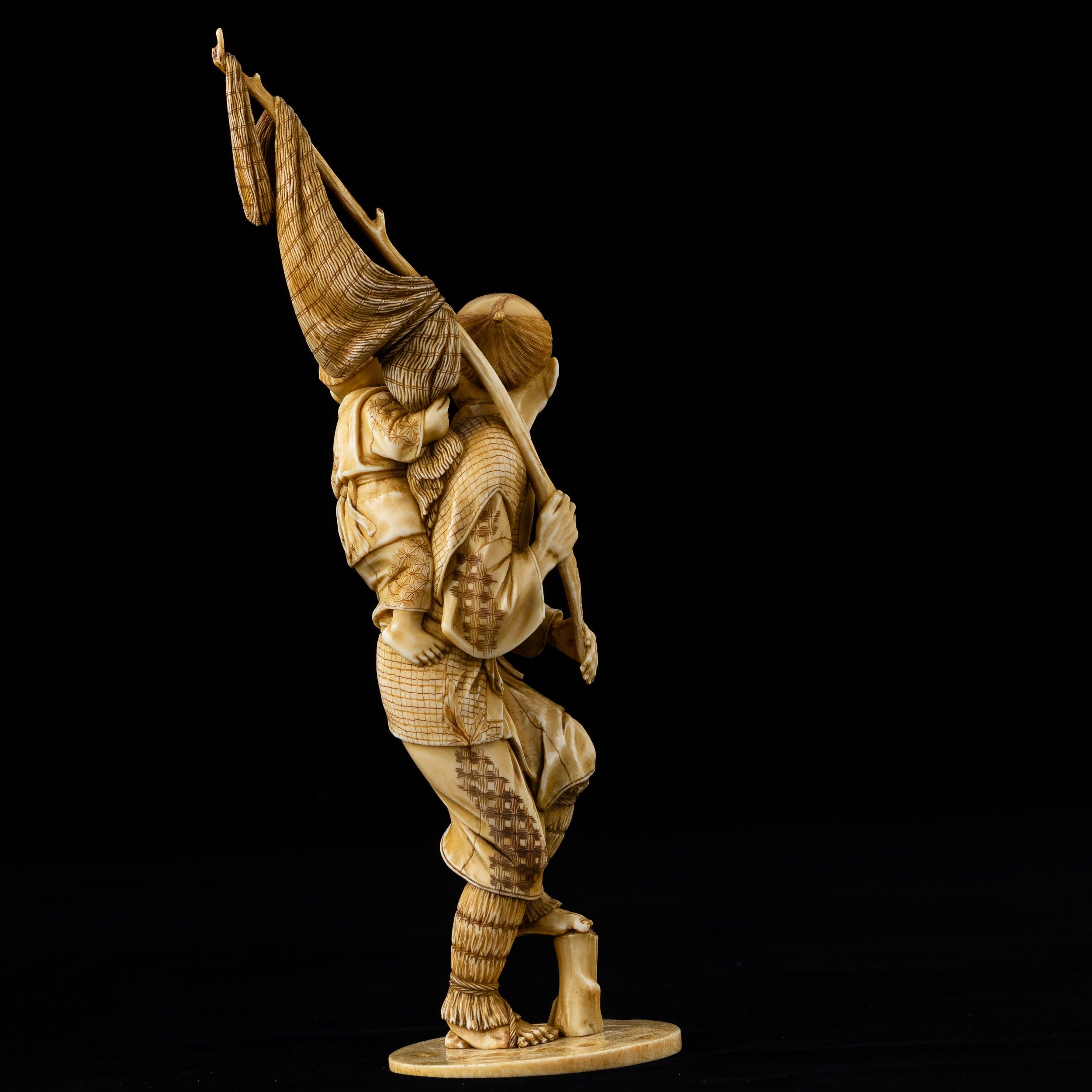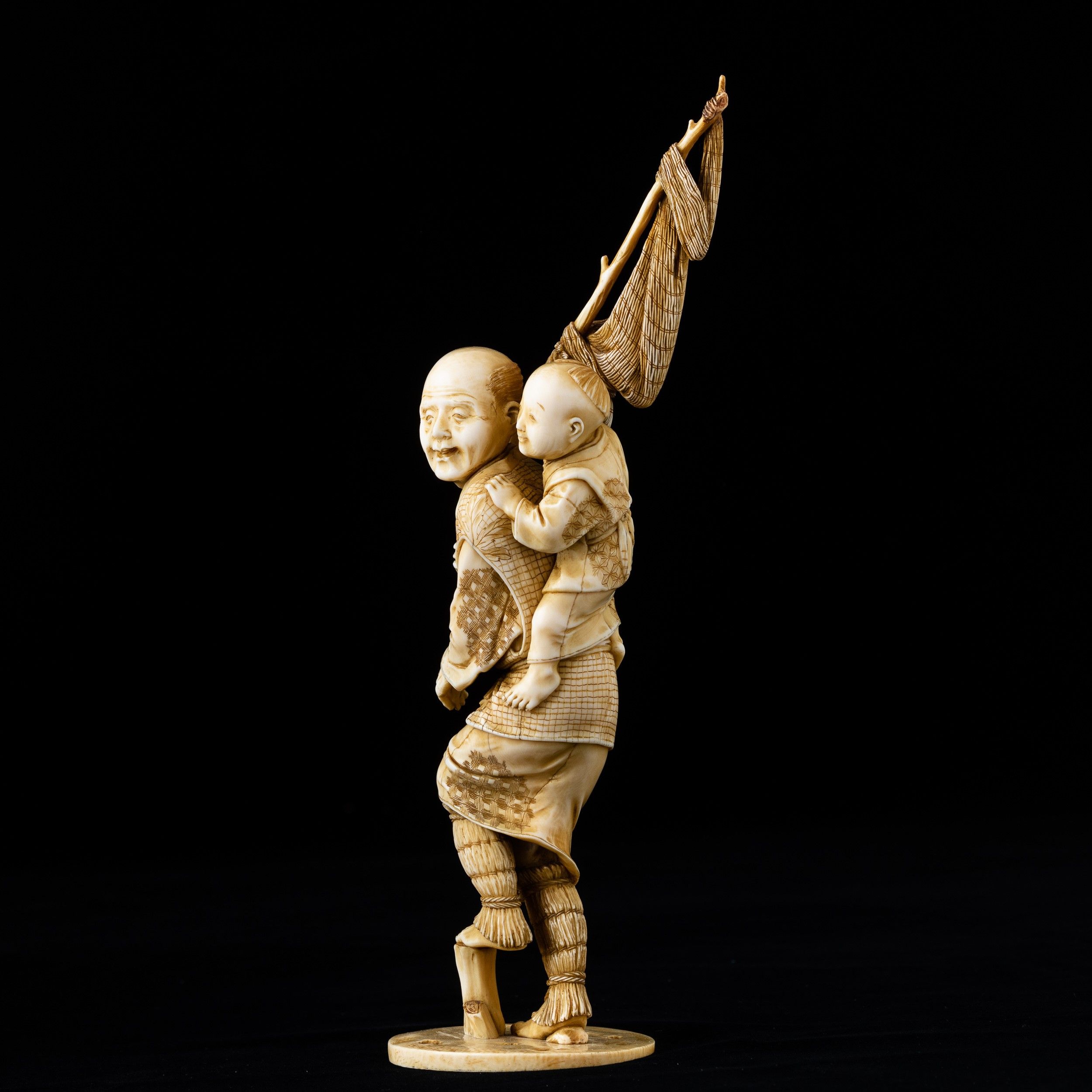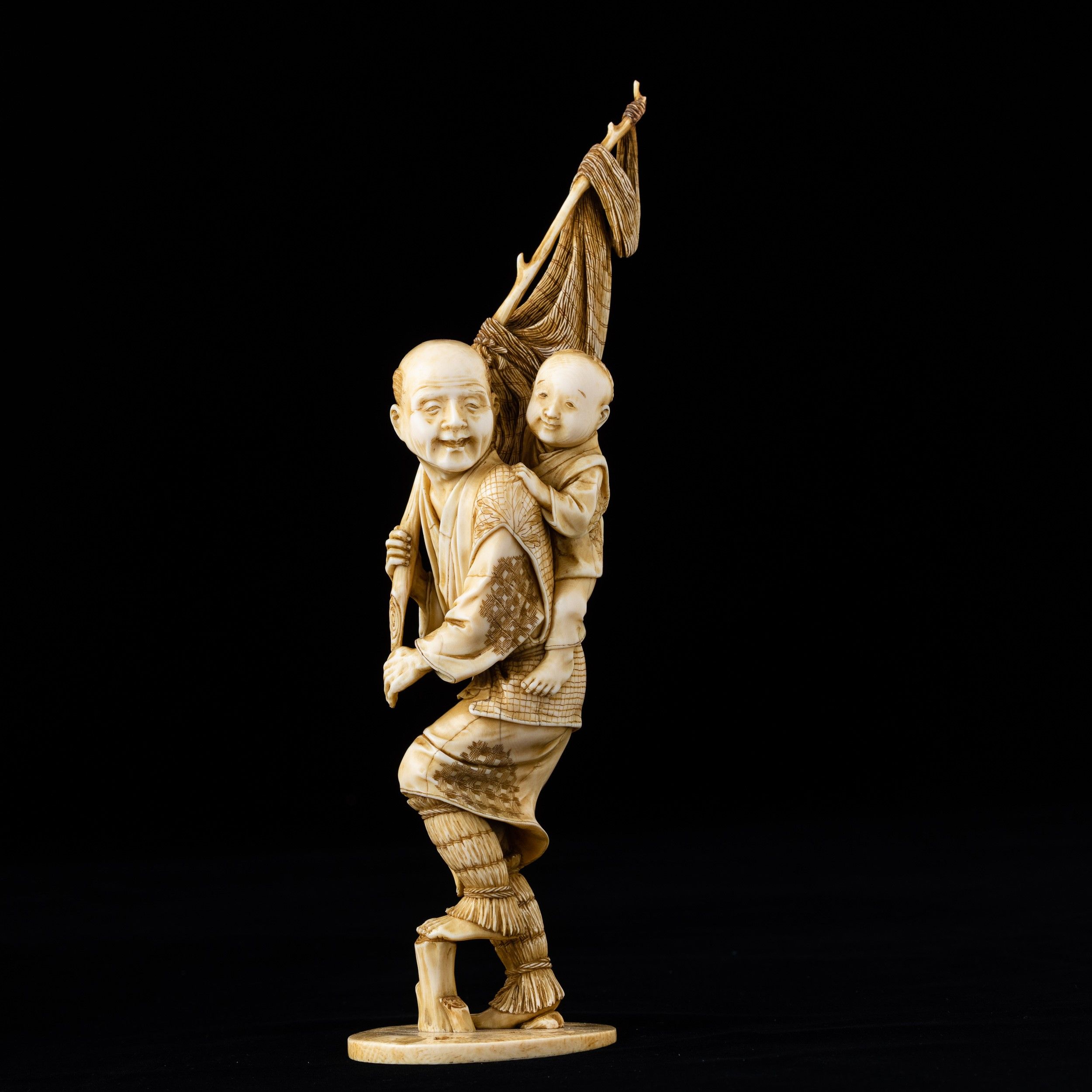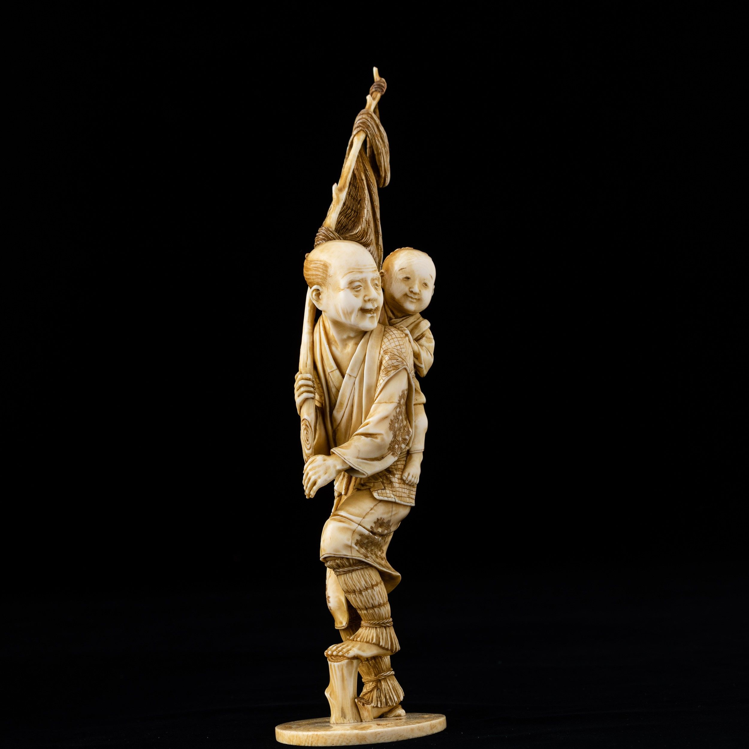 Okimono scolpito in avorio raffigurante pescatore con fanciullo, Giappone, periodo [..]