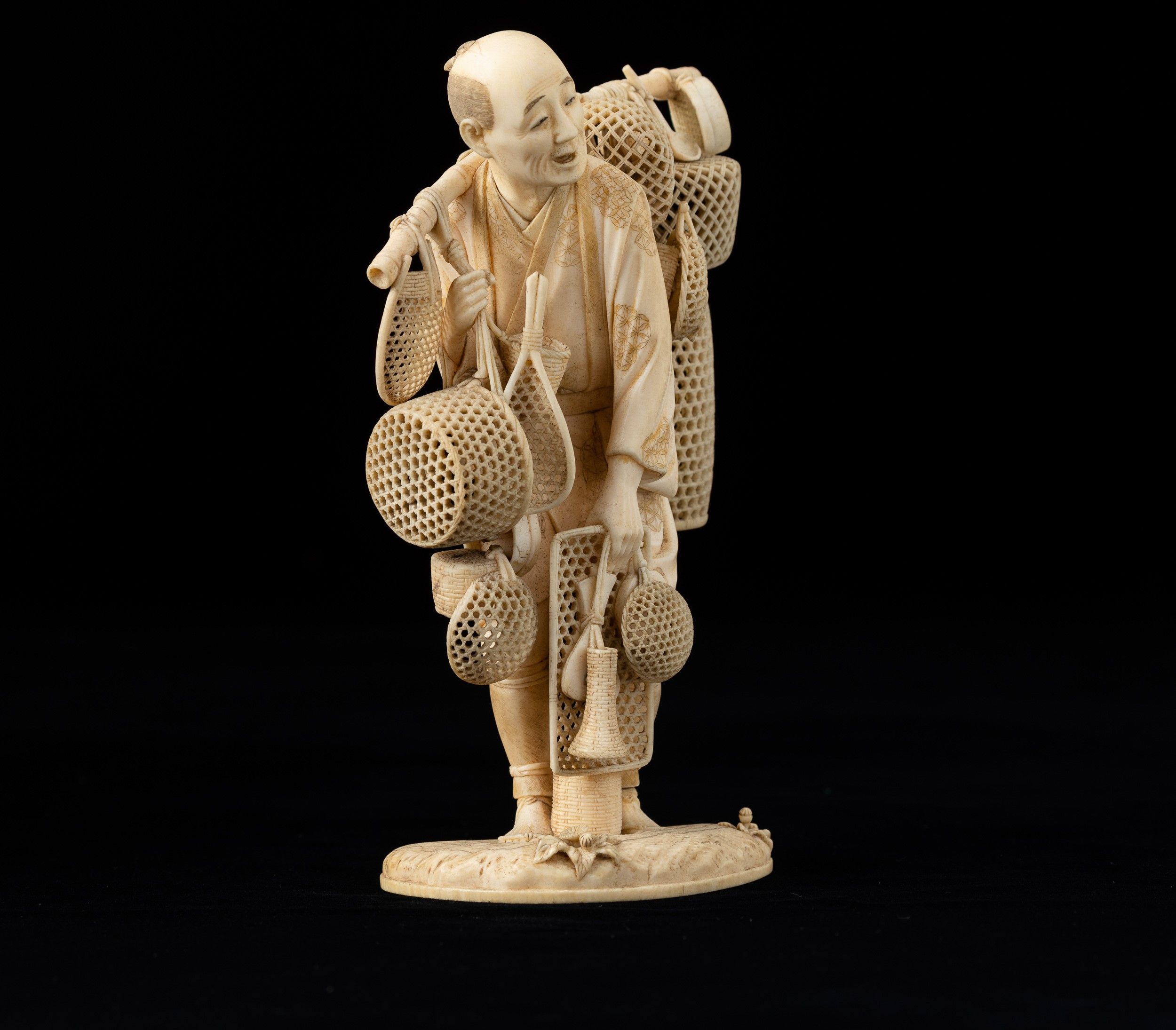 Okimono scolpito in avorio raffigurante venditore di ceste, Giappone, periodo Meiji [..]