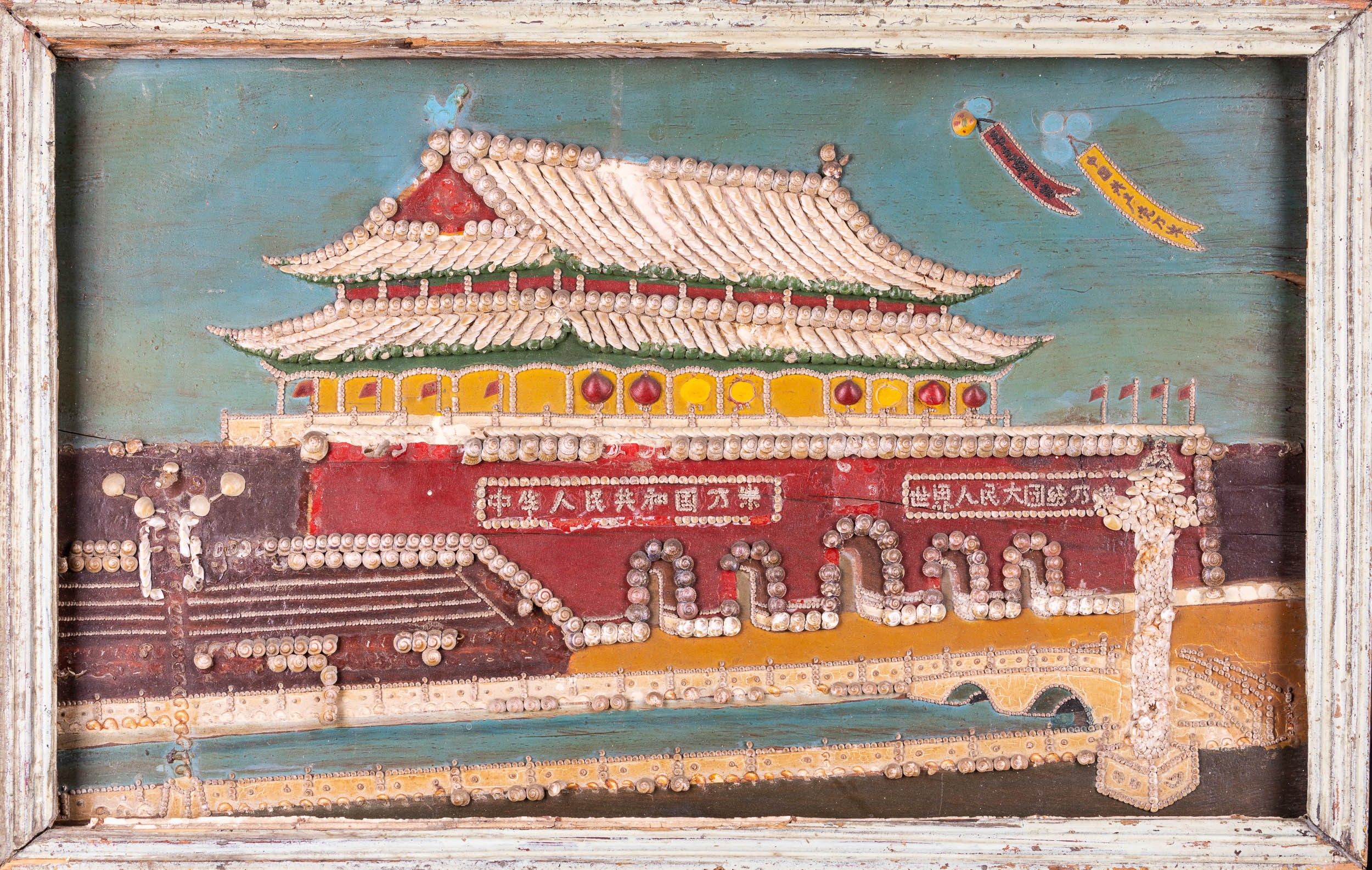 Pannello con riproduzione del palazzo imperiale con innesti di conchiglie, Cina, [..]