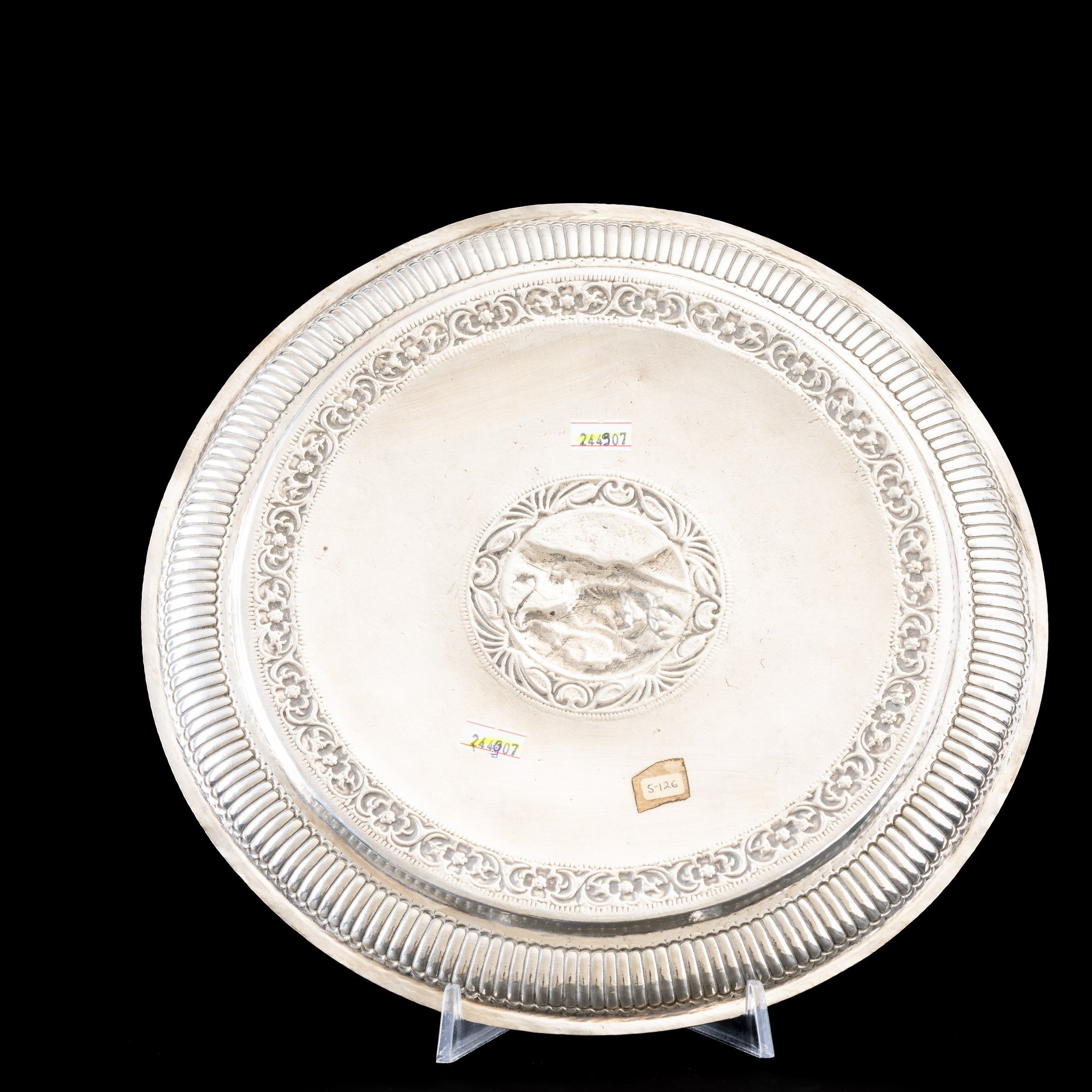 Piatto circolare in argento sbalzato e inciso con scena di leone che aggredisce [..]