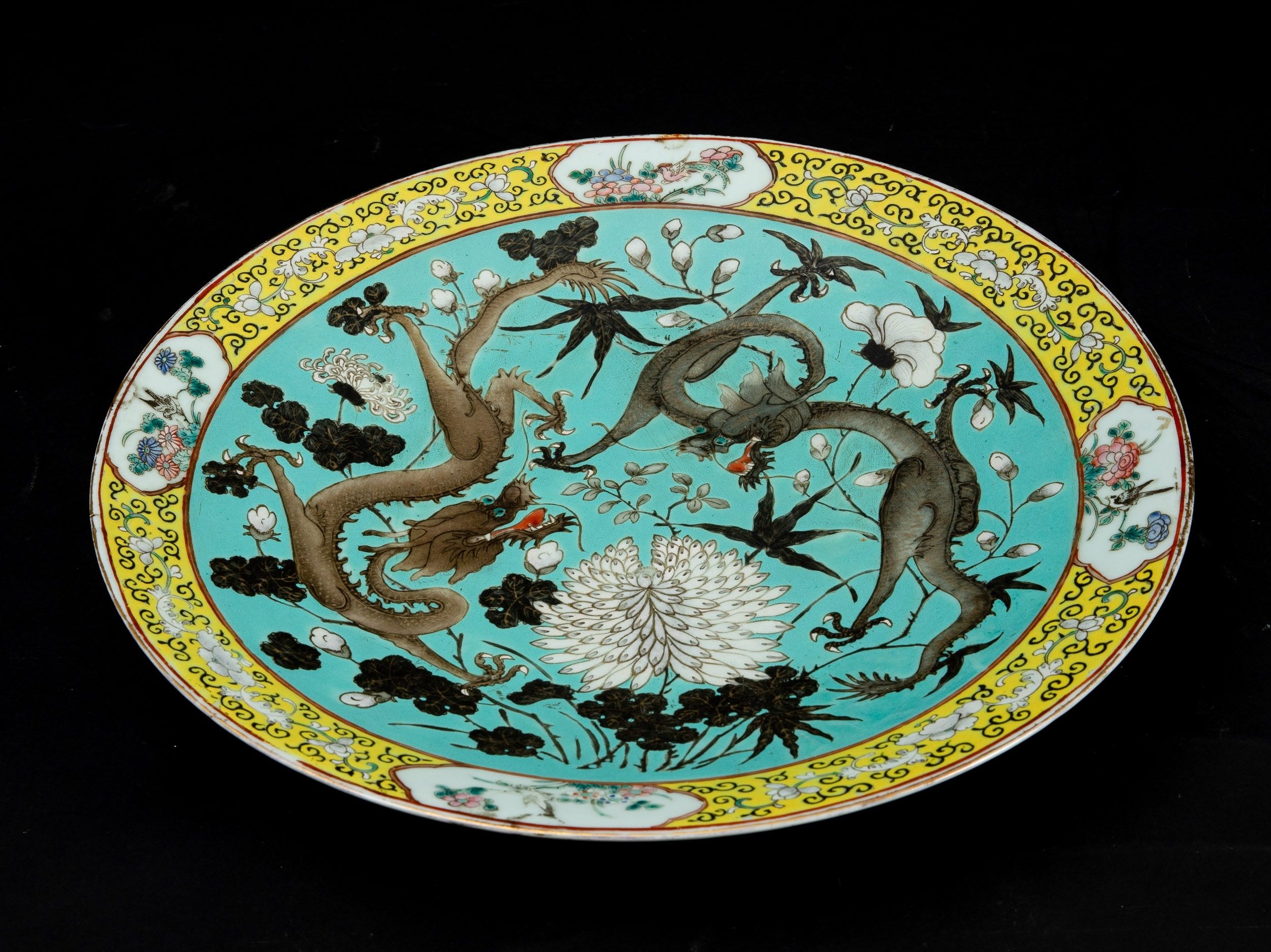 Piatto in porcellana con figure di draghi e decori floreali, Cina, Dinastia Qing, [..]