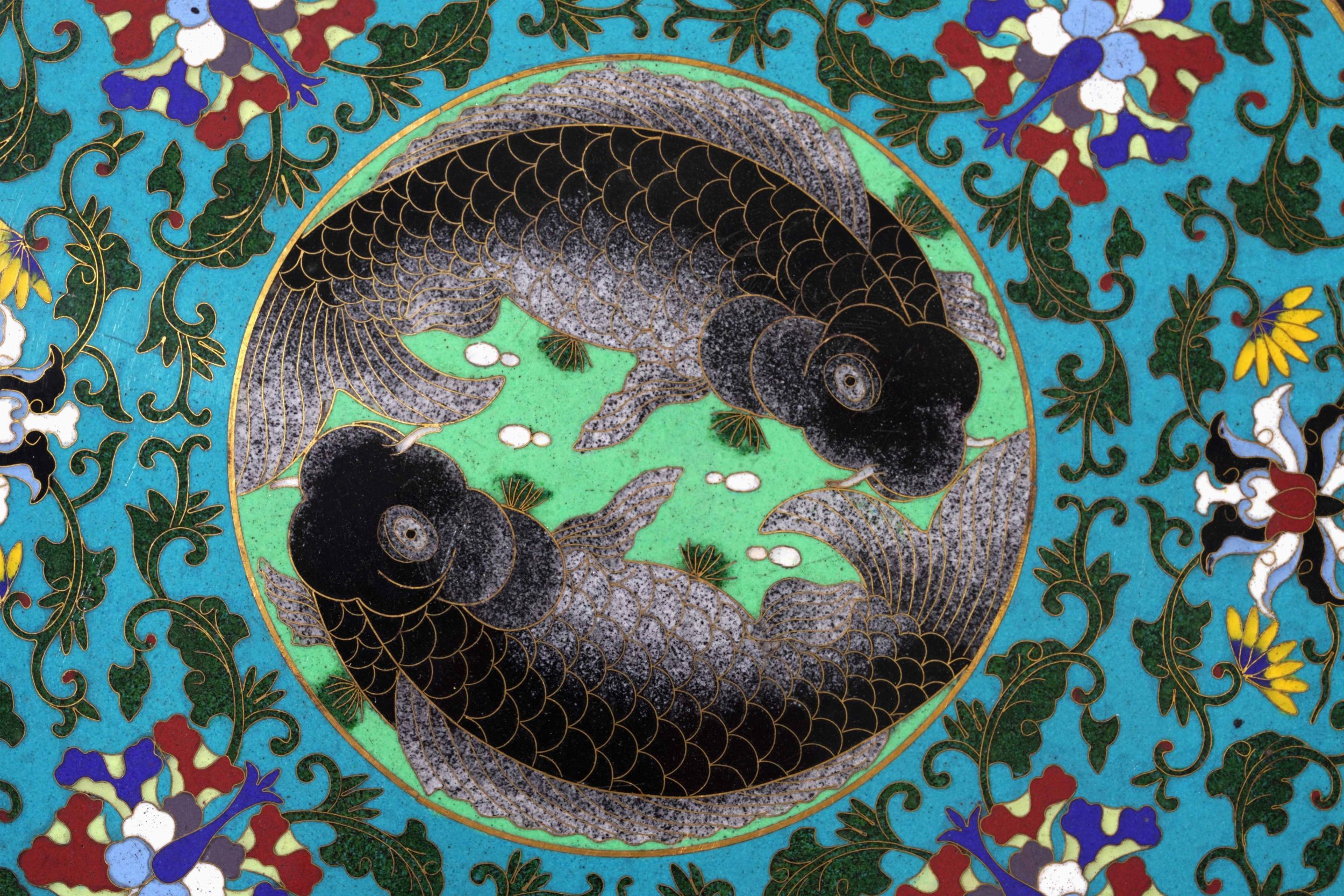 Tavolo basso con medaglioni a smalti cloissonè raffiguranti carpe, aironi e decori [..]
