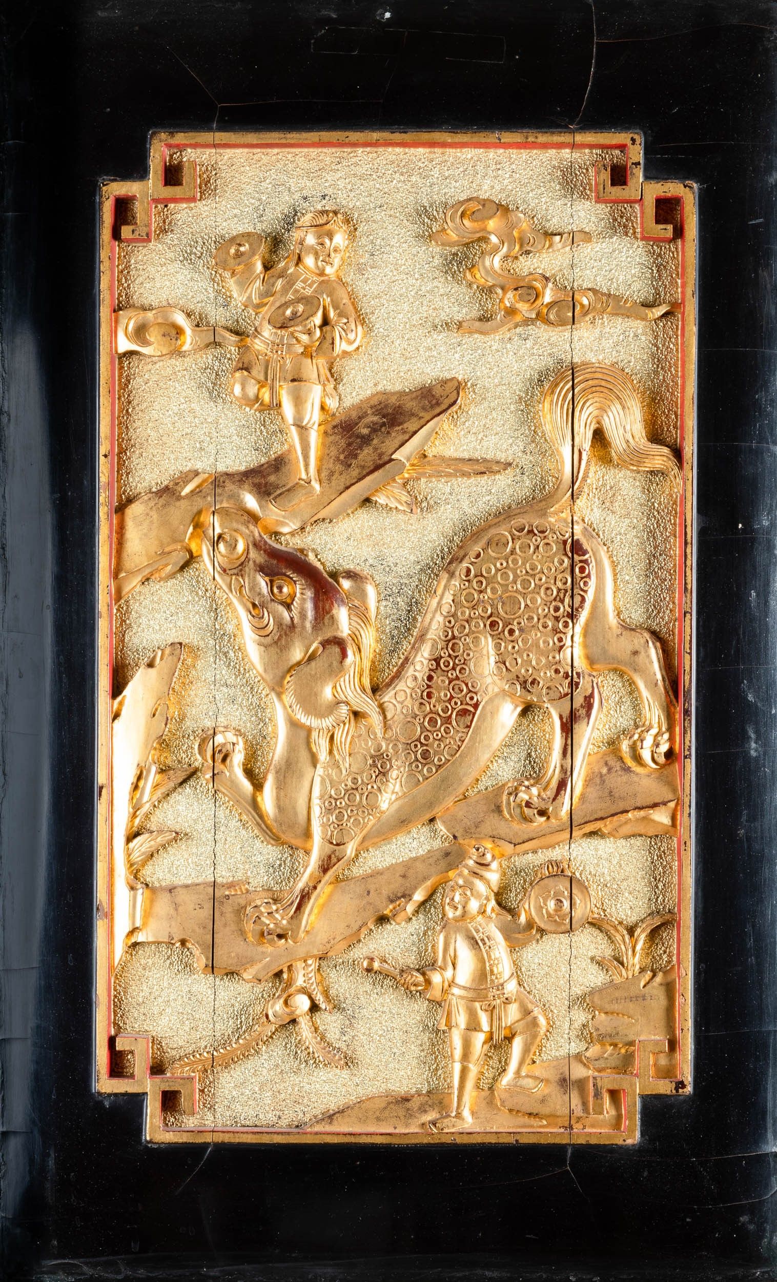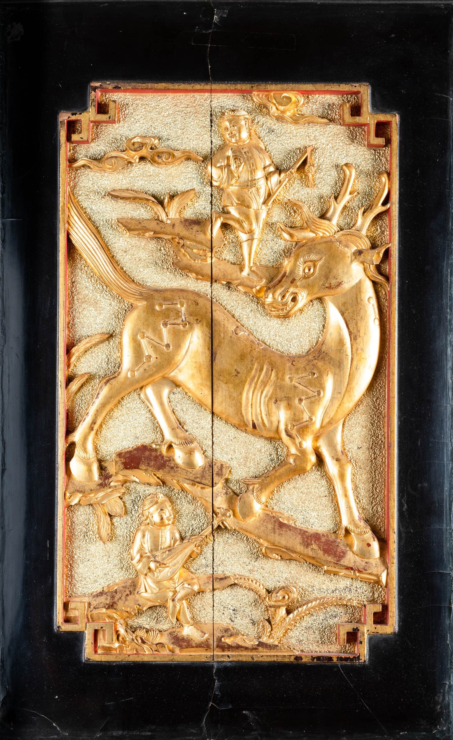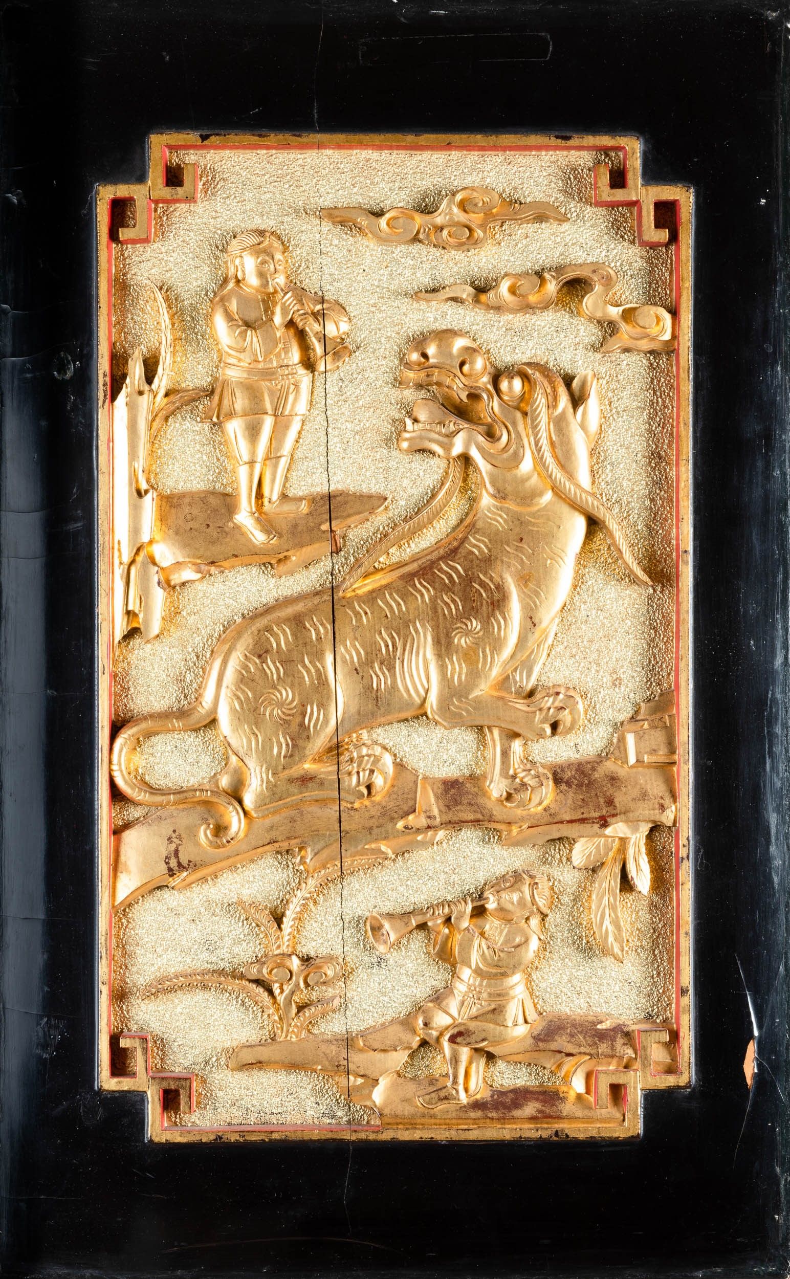 Tre pannelli in legno laccato e dorato raffiguranti soggetti naturalistici con animali [..]
